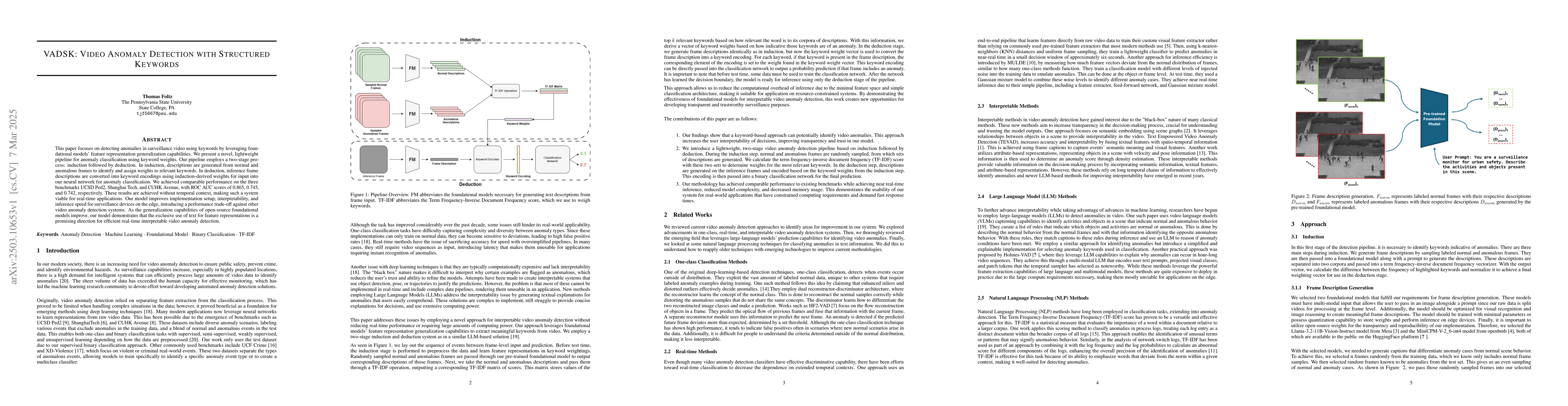 The research introduces a novel, lightweight pipeline for video anomaly detection using structured keywords, leveraging foundational models' feature representation generalization capabilities. The pipeline employs a two-stage process: induction, where descriptions are generated from normal and anomalous frames to identify and assign weights to relevant keywords, and deduction, where inference frame descriptions are converted into keyword encodings for input into a neural network for anomaly classification.