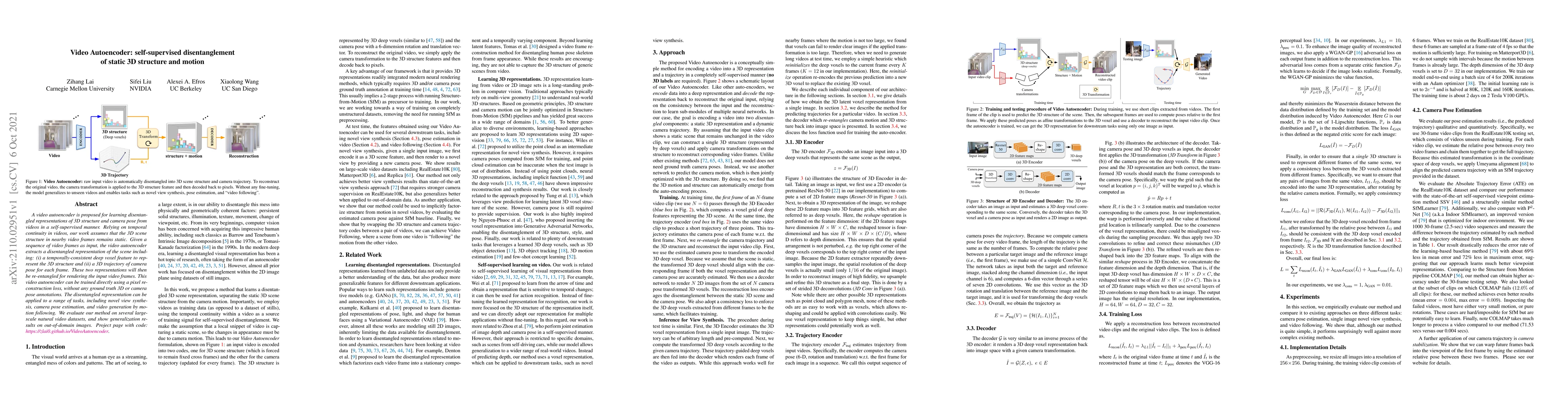 This paper proposes a video autoencoder for self-supervised learning of disentangled representations of 3D scene structure and camera pose from video frames. The method trains without ground truth annotations, achieving applications like novel view synthesis and camera pose estimation.