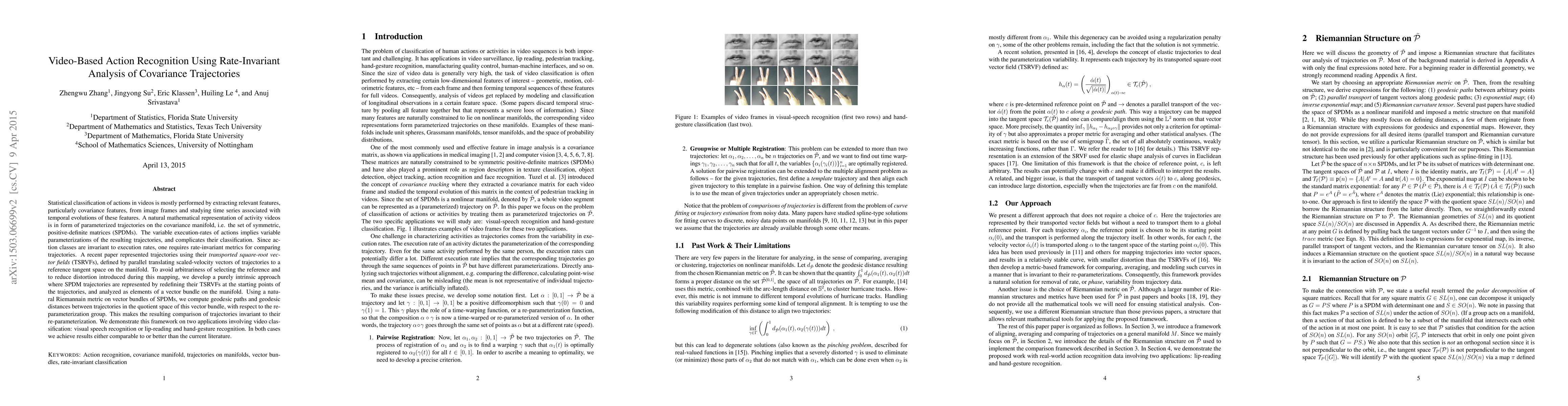 Statistical classification of actions in videos is mostly performed by extracting relevant features, particularly covariance features, from image frames and studying time series associated with temporal evolutions of these features. A natural mathematical representation of activity videos is in form of parameterized trajectories on the covariance manifold, i.e. the set of symmetric, positive-definite matrices (SPDMs). The variable execution-rates of actions implies variable parameterizations of the resulting trajectories, and complicates their classification. Since action classes are invariant to execution rates, one requires rate-invariant metrics for comparing trajectories. A recent paper represented trajectories using their transported square-root vector fields (TSRVFs), defined by parallel translating scaled-velocity vectors of trajectories to a reference tangent space on the manifold. To avoid arbitrariness of selecting the reference and to reduce distortion introduced during this mapping, we develop a purely intrinsic approach where SPDM trajectories are represented by redefining their TSRVFs at the starting points of the trajectories, and analyzed as elements of a vector bundle on the manifold. Using a natural Riemannain metric on vector bundles of SPDMs, we compute geodesic paths and geodesic distances between trajectories in the quotient space of this vector bundle, with respect to the re-parameterization group. This makes the resulting comparison of trajectories invariant to their re-parameterization. We demonstrate this framework on two applications involving video classification: visual speech recognition or lip-reading and hand-gesture recognition. In both cases we achieve results either comparable to or better than the current literature.
