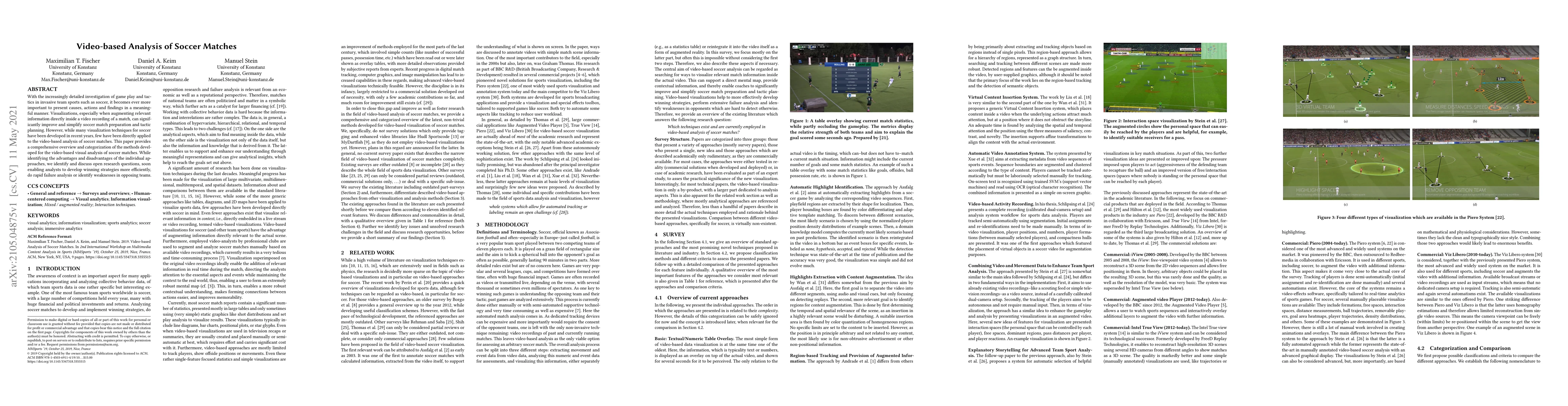 With the increasingly detailed investigation of game play and tactics in invasive team sports such as soccer, it becomes ever more important to present causes, actions and findings in a meaningful manner. Visualizations, especially when augmenting relevant information directly inside a video recording of a match, can significantly improve and simplify soccer match preparation and tactic planning. However, while many visualization techniques for soccer have been developed in recent years, few have been directly applied to the video-based analysis of soccer matches. This paper provides a comprehensive overview and categorization of the methods developed for the video-based visual analysis of soccer matches. While identifying the advantages and disadvantages of the individual approaches, we identify and discuss open research questions, soon enabling analysts to develop winning strategies more efficiently, do rapid failure analysis or identify weaknesses in opposing teams.