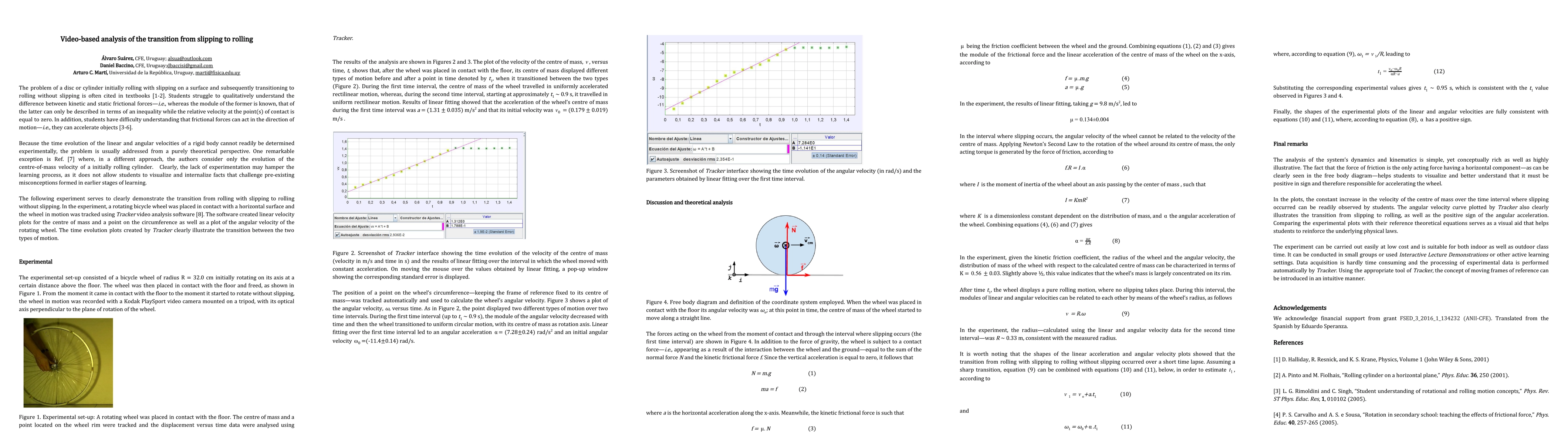 The problem of a disc or cylinder initially rolling with slipping on a surface and subsequently transitioning to rolling without slipping is often cited in textbooks. The following experiment serves to clearly demonstrate the transition from rolling with slipping to rolling without slipping. In the experiment, a rotating bicycle wheel was placed in contact with a horizontal surface and the wheel in motion was tracked using Tracker video analysis software [8]. The software created linear velocity plots for the centre of mass and a point on the circumference as well as a plot of the angular velocity of the rotating wheel. The time evolution plots created by Tracker clearly illustrate the transition between the two types of motion.