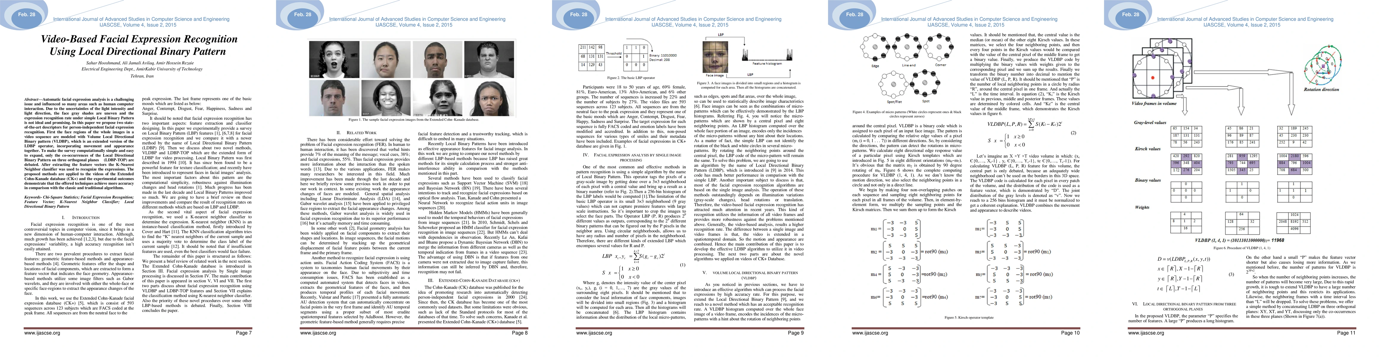 This paper proposes advanced descriptors, Volume Local Directional Binary Pattern (VLDBP) and Local Directional Binary Pattern on three orthogonal planes (LDBP-TOP), for person-independent facial expression recognition in video sequences. The K-Nearest Neighbor classifier achieved higher accuracy compared to traditional methods when tested on the CK+ database.