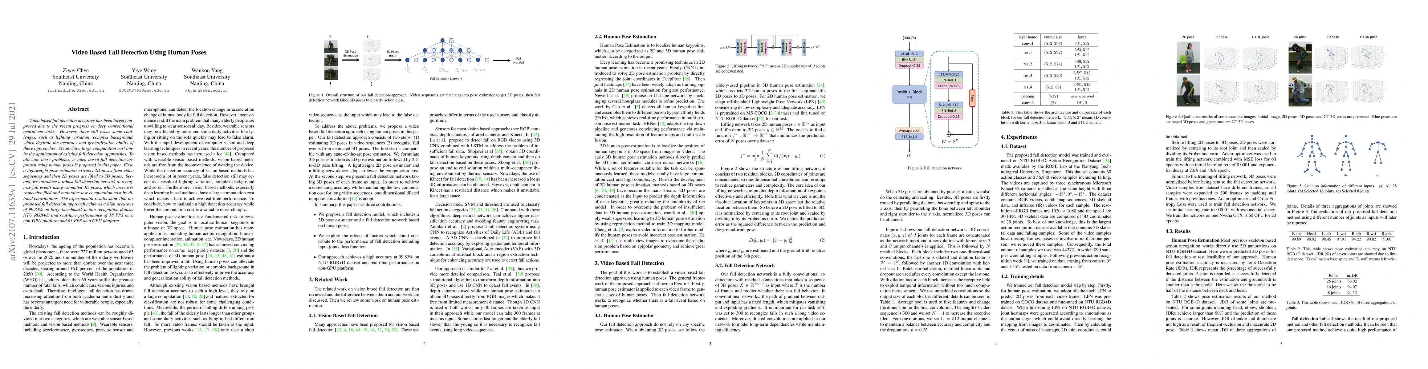 Video based fall detection accuracy has been largely improved due to the recent progress on deep convolutional neural networks. However, there still exists some challenges, such as lighting variation, complex background, which degrade the accuracy and generalization ability of these approaches. Meanwhile, large computation cost limits the application of existing fall detection approaches. To alleviate these problems, a video based fall detection approach using human poses is proposed in this paper. First, a lightweight pose estimator extracts 2D poses from video sequences and then 2D poses are lifted to 3D poses. Second, we introduce a robust fall detection network to recognize fall events using estimated 3D poses, which increases respective filed and maintains low computation cost by dilated convolutions. The experimental results show that the proposed fall detection approach achieves a high accuracy of 99.83% on large benchmark action recognition dataset NTU RGB+D and real-time performance of 18 FPS on a non-GPU platform and 63 FPS on a GPU platform.