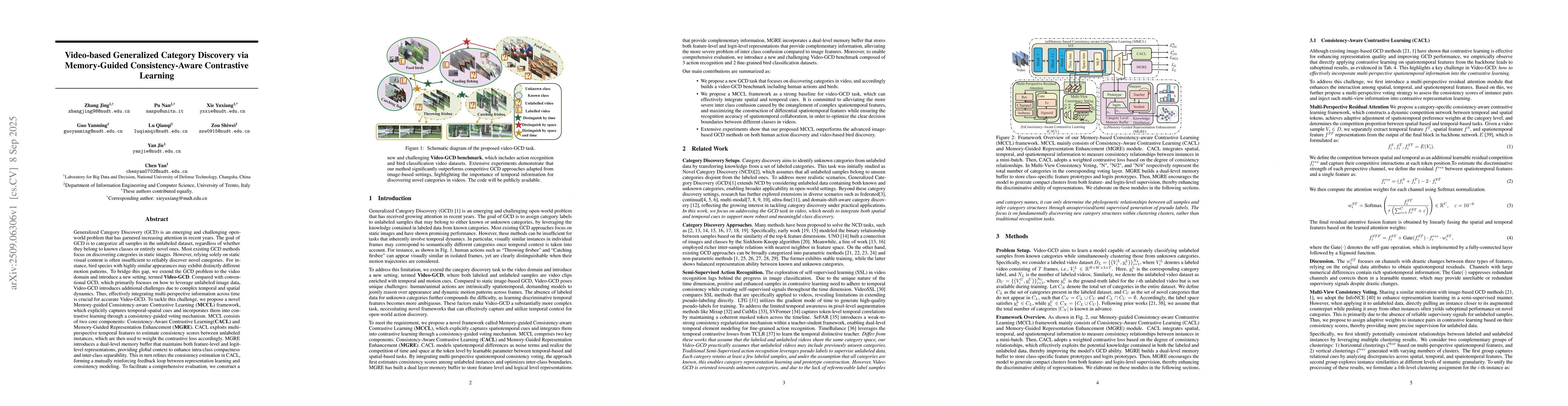 Generalized Category Discovery (GCD) is an emerging and challenging open-world problem that has garnered increasing attention in recent years. Most existing GCD methods focus on discovering categories in static images. However, relying solely on static visual content is often insufficient to reliably discover novel categories. To bridge this gap, we extend the GCD problem to the video domain and introduce a new setting, termed Video-GCD. Thus, effectively integrating multi-perspective information across time is crucial for accurate Video-GCD. To tackle this challenge, we propose a novel Memory-guided Consistency-aware Contrastive Learning (MCCL) framework, which explicitly captures temporal-spatial cues and incorporates them into contrastive learning through a consistency-guided voting mechanism. MCCL consists of two core components: Consistency-Aware Contrastive Learning(CACL) and Memory-Guided Representation Enhancement (MGRE). CACL exploits multiperspective temporal features to estimate consistency scores between unlabeled instances, which are then used to weight the contrastive loss accordingly. MGRE introduces a dual-level memory buffer that maintains both feature-level and logit-level representations, providing global context to enhance intra-class compactness and inter-class separability. This in turn refines the consistency estimation in CACL, forming a mutually reinforcing feedback loop between representation learning and consistency modeling. To facilitate a comprehensive evaluation, we construct a new and challenging Video-GCD benchmark, which includes action recognition and bird classification video datasets. Extensive experiments demonstrate that our method significantly outperforms competitive GCD approaches adapted from image-based settings, highlighting the importance of temporal information for discovering novel categories in videos. The code will be publicly available.