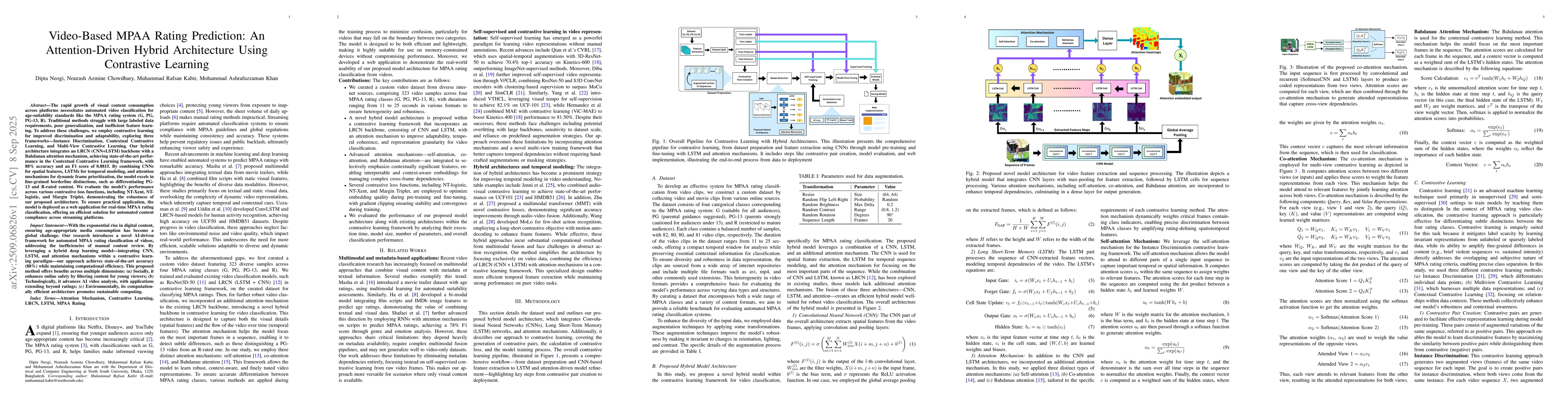 The rapid growth of visual content consumption across platforms necessitates automated video classification for age-suitability standards like the MPAA rating system (G, PG, PG-13, R). Traditional methods struggle with large labeled data requirements, poor generalization, and inefficient feature learning. To address these challenges, we employ contrastive learning for improved discrimination and adaptability, exploring three frameworks: Instance Discrimination, Contextual Contrastive Learning, and Multi-View Contrastive Learning. Our hybrid architecture integrates an LRCN (CNN+LSTM) backbone with a Bahdanau attention mechanism, achieving state-of-the-art performance in the Contextual Contrastive Learning framework, with 88% accuracy and an F1 score of 0.8815. By combining CNNs for spatial features, LSTMs for temporal modeling, and attention mechanisms for dynamic frame prioritization, the model excels in fine-grained borderline distinctions, such as differentiating PG-13 and R-rated content. We evaluate the model's performance across various contrastive loss functions, including NT-Xent, NT-logistic, and Margin Triplet, demonstrating the robustness of our proposed architecture. To ensure practical application, the model is deployed as a web application for real-time MPAA rating classification, offering an efficient solution for automated content compliance across streaming platforms.