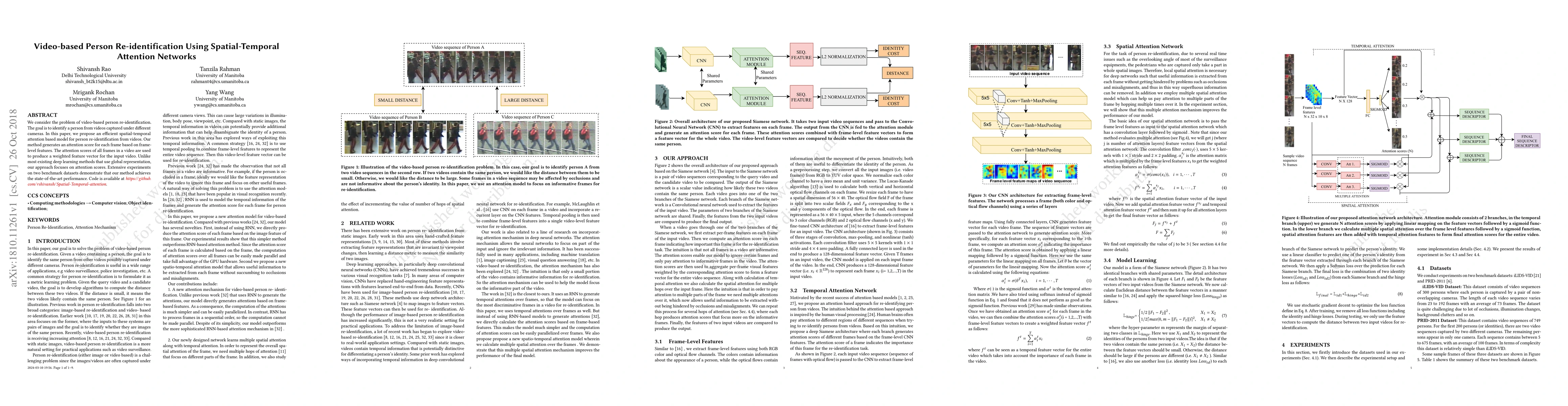 This paper proposes a spatial-temporal attention network for video-based person re-identification, generating attention scores for each frame to create a weighted feature vector. The method outperforms existing global representation techniques, achieving state-of-the-art results on benchmark datasets.