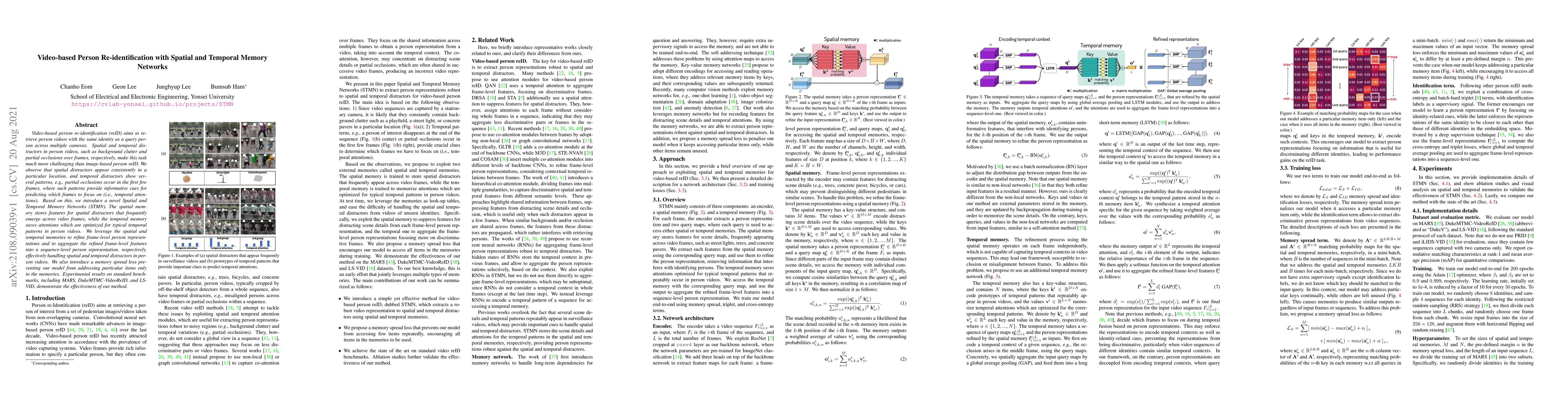 This paper proposes a Spatial and Temporal Memory Networks (STMN) to tackle video-based person re-identification challenges caused by spatial and temporal distractors. The spatial memory addresses consistent spatial distractors, while the temporal memory optimizes attention for typical temporal patterns, refining person representations and improving re-identification accuracy on benchmarks like MARS, DukeMTMC-VideoReID, and LS-VID.