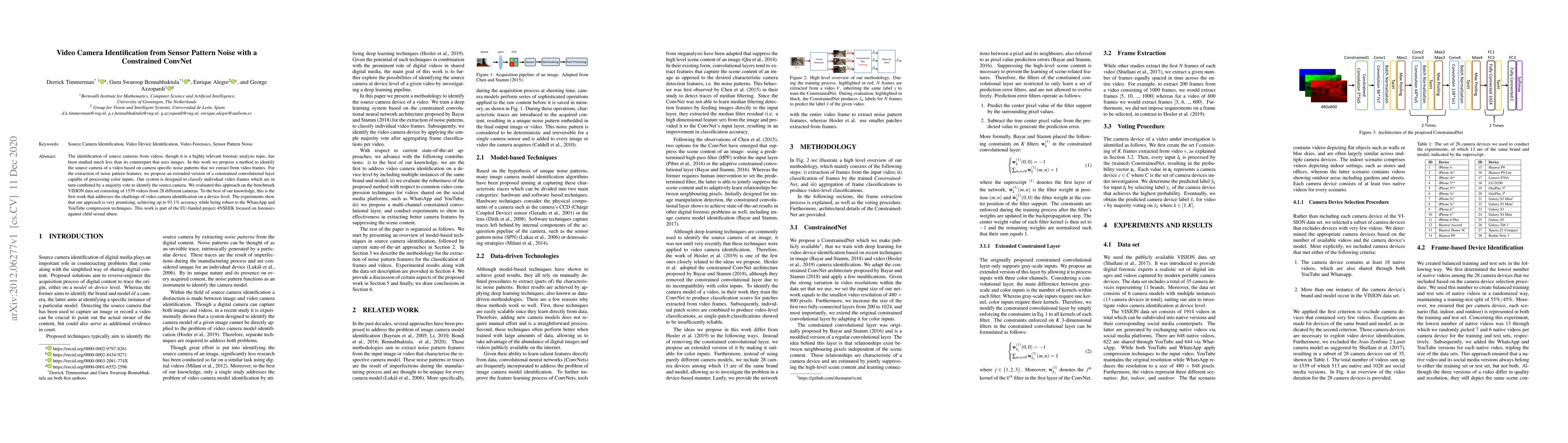 Researchers propose a method to identify camera source from video frames using extracted noise patterns, achieving 93.1% accuracy in classification, with robustness to compression techniques.