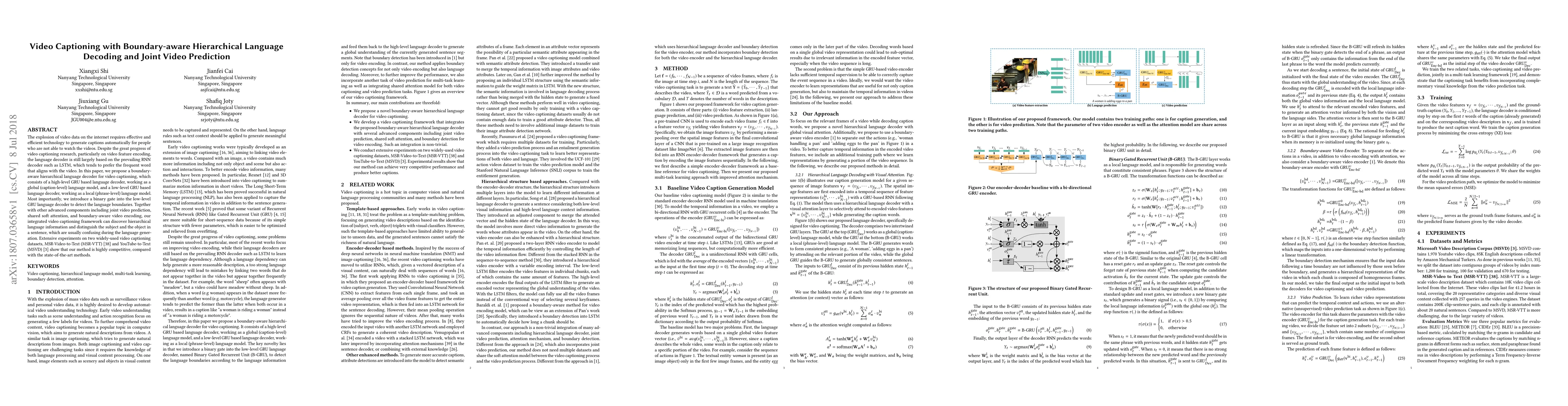 This paper proposes a boundary-aware hierarchical language decoder for video captioning, combining a high-level global language model with a low-level local model to detect language boundaries. The framework integrates joint video prediction and shared soft attention, achieving competitive results on MSR-VTT and MSVD datasets.