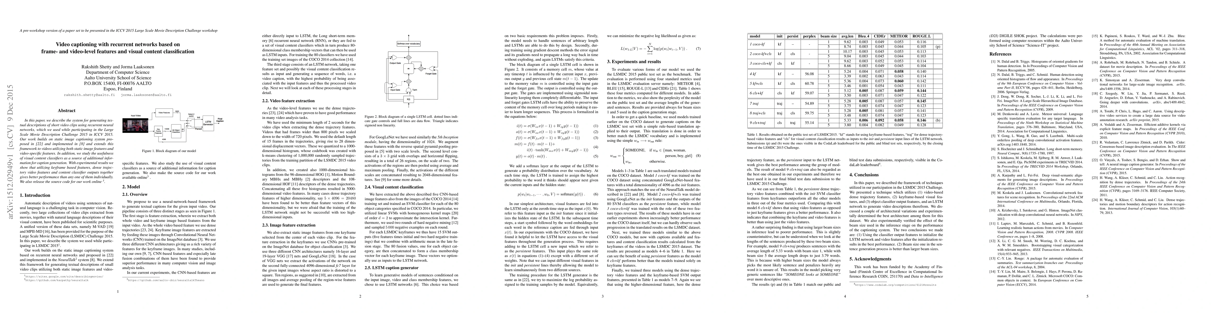 In this paper, we describe the system for generating textual descriptions of short video clips using recurrent neural networks (RNN), which we used while participating in the Large Scale Movie Description Challenge 2015 in ICCV 2015. Our work builds on static image captioning systems with RNN based language models and extends this framework to videos utilizing both static image features and video-specific features. In addition, we study the usefulness of visual content classifiers as a source of additional information for caption generation. With experimental results we show that utilizing keyframe based features, dense trajectory video features and content classifier outputs together gives better performance than any one of them individually.