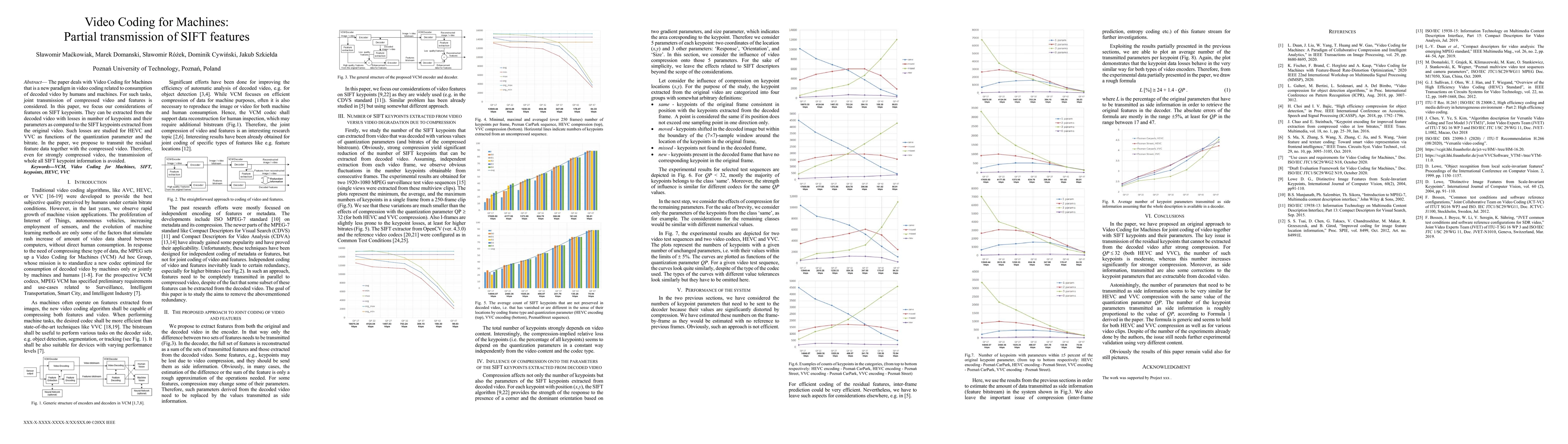 This paper explores a new paradigm in video coding for machine consumption, focusing on the partial transmission of SIFT features alongside compressed video. It examines the losses incurred in SIFT keypoints during compression with HEVC and VVC, proposing the transmission of residual feature data to avoid the complete transmission of all SIFT keypoint information.