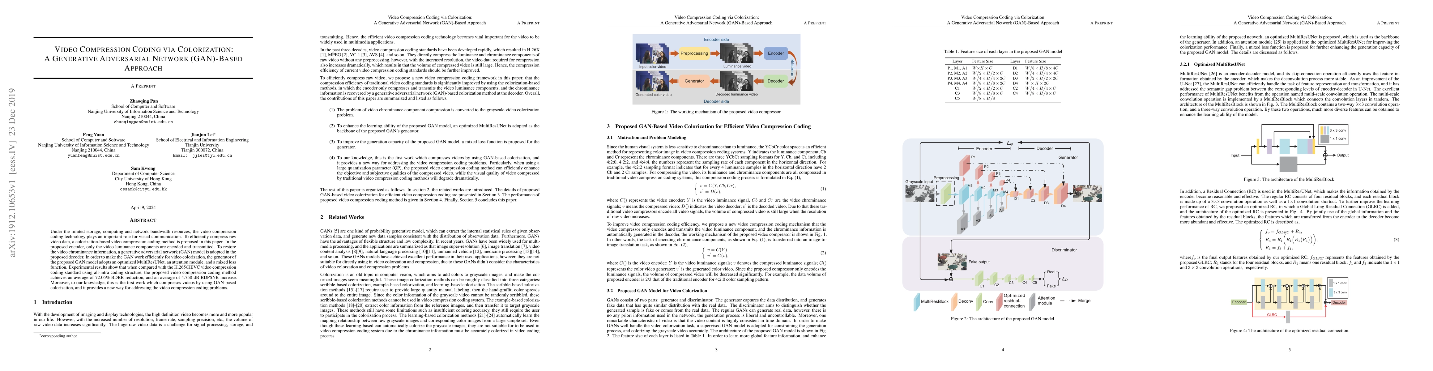 This paper proposes a novel video compression method using a GAN-based colorization approach, where only the luminance components are encoded and transmitted, and a GAN decoder restores the chrominance information. The method achieves significant BDBR reduction and BDPSNR improvement compared to H.265/HEVC, marking the first use of GANs for video compression via colorization.
