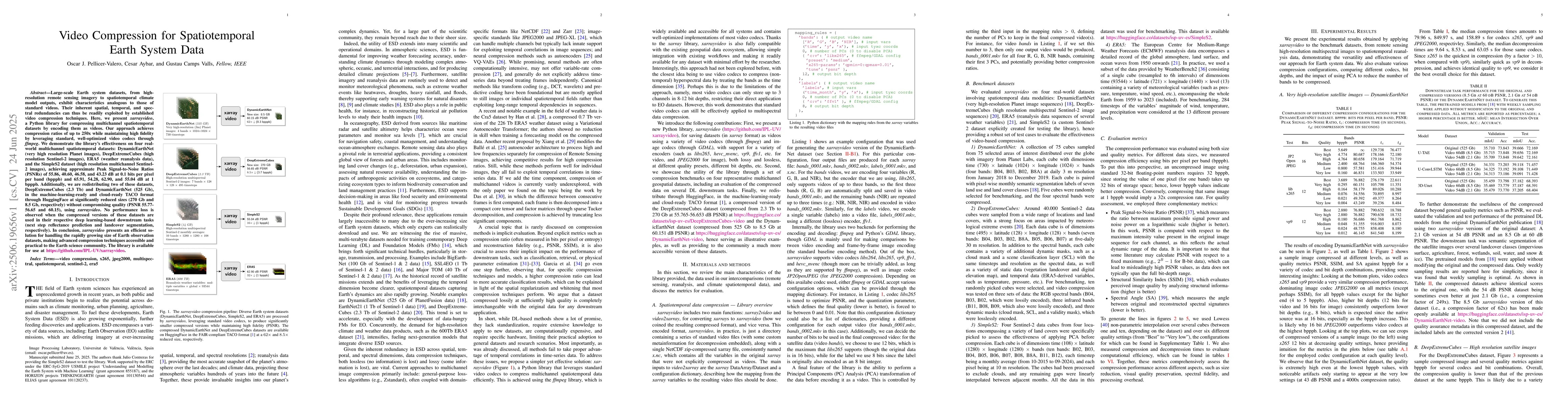 Large-scale Earth system datasets, from high-resolution remote sensing imagery to spatiotemporal climate model outputs, exhibit characteristics analogous to those of standard videos. Their inherent spatial, temporal, and spectral redundancies can thus be readily exploited by established video compression techniques. Here, we present xarrayvideo, a Python library for compressing multichannel spatiotemporal datasets by encoding them as videos. Our approach achieves compression ratios of up to 250x while maintaining high fidelity by leveraging standard, well-optimized video codecs through ffmpeg. We demonstrate the library's effectiveness on four real-world multichannel spatiotemporal datasets: DynamicEarthNet (very high resolution Planet images), DeepExtremeCubes (high resolution Sentinel-2 images), ERA5 (weather reanalysis data), and the SimpleS2 dataset (high resolution multichannel Sentinel-2 images), achieving Peak Signal-to-Noise Ratios (PSNRs) of 55.86, 40.60, 46.58, and 43.23 dB at 0.1 bits per pixel per band (bpppb) and 65.91, 54.28, 62.90, and 55.04 dB at 1 bpppb. We are redistributing two of these datasets, DeepExtremeCubes (2.3 Tb) and DynamicEarthNet (525 Gb), in the machine-learning-ready and cloud-ready TACO format through HuggingFace at significantly reduced sizes (270 Gb and 8.5 Gb, respectively) without compromising quality (PSNR 55.77-56.65 and 60.15). No performance loss is observed when the compressed versions of these datasets are used in their respective deep learning-based downstream tasks (next step reflectance prediction and landcover segmentation). In conclusion, xarrayvideo presents an efficient solution for handling the rapidly growing size of Earth observation datasets, making advanced compression techniques accessible and practical to the Earth science community. The library is available for use at https://github.com/IPL-UV/xarrayvideo