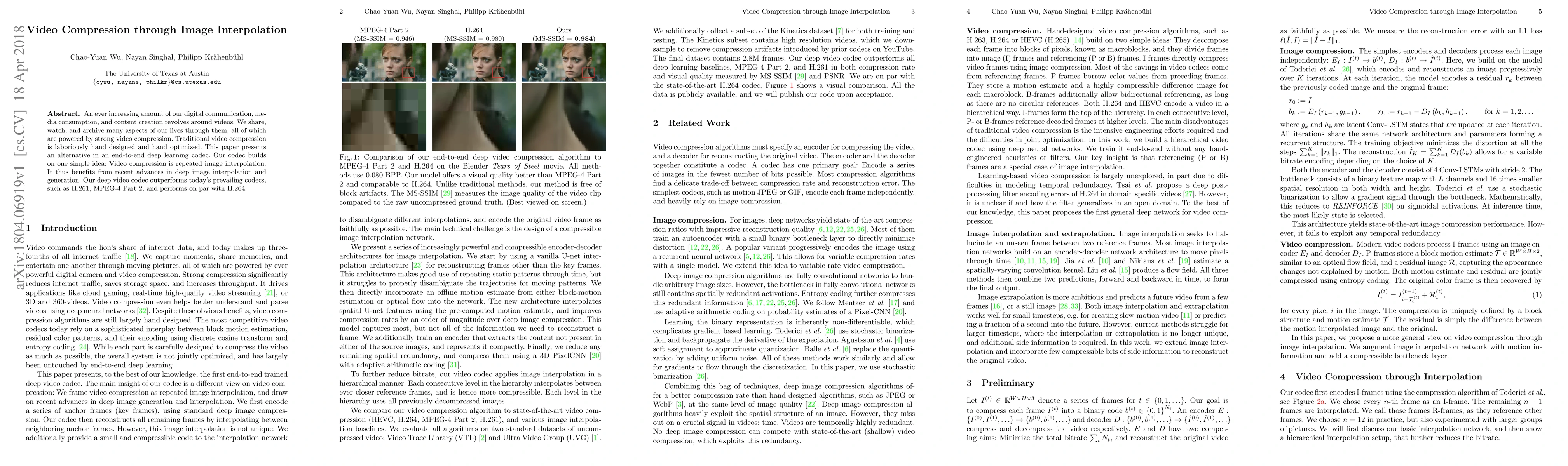 This paper proposes a novel video compression method using deep learning for end-to-end encoding, treating compression as repeated image interpolation, which leverages recent advances in deep image generation. The proposed codec outperforms traditional methods like H.261 and MPEG-4 Part 2, and matches the performance of H.264.