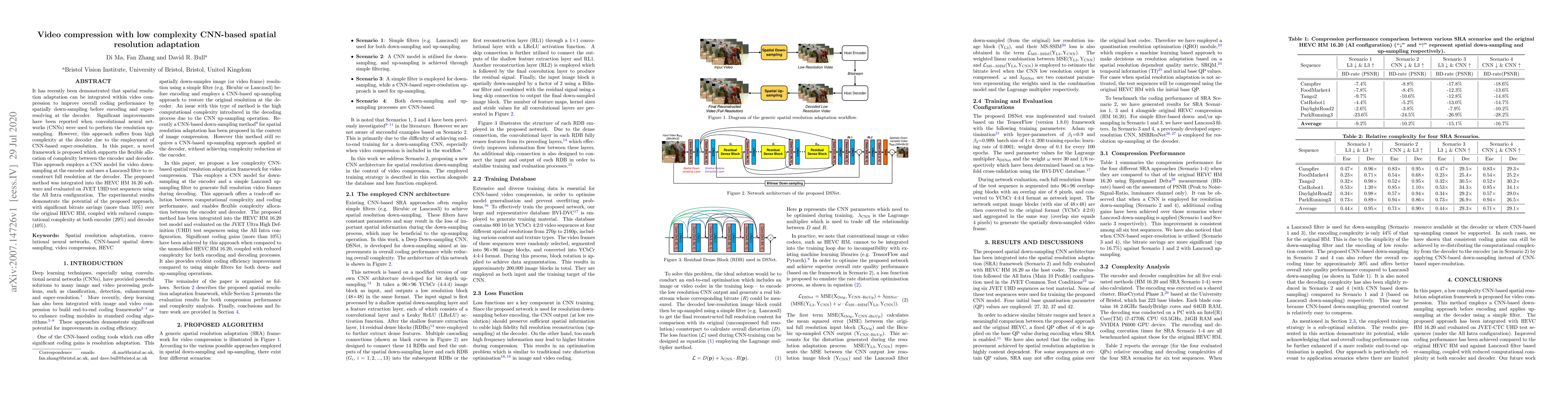 The paper proposes a low complexity CNN-based spatial resolution adaptation framework for video compression, employing CNN for down-sampling at the encoder and a Lanczos3 filter for full resolution reconstruction at the decoder. It was integrated into HEVC HM 16.20 and evaluated on JVET UHD test sequences.