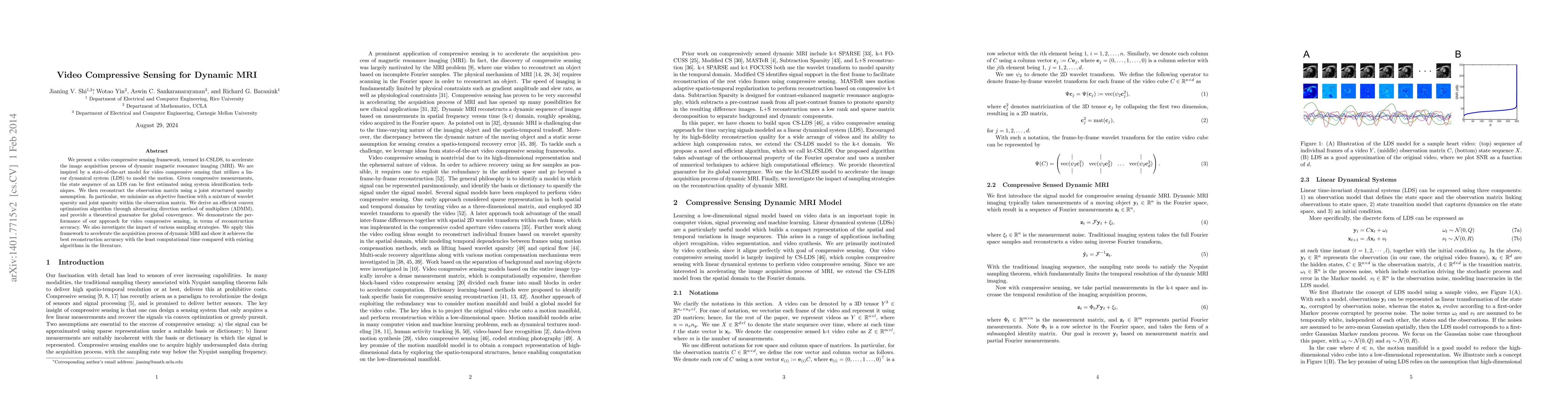 This paper introduces kt-CSLDS, a video compressive sensing framework for dynamic MRI that accelerates image acquisition by leveraging a linear dynamical system model and joint structured sparsity. The method uses an efficient convex optimization algorithm with ADMM and achieves superior reconstruction accuracy and computational efficiency compared to existing algorithms.