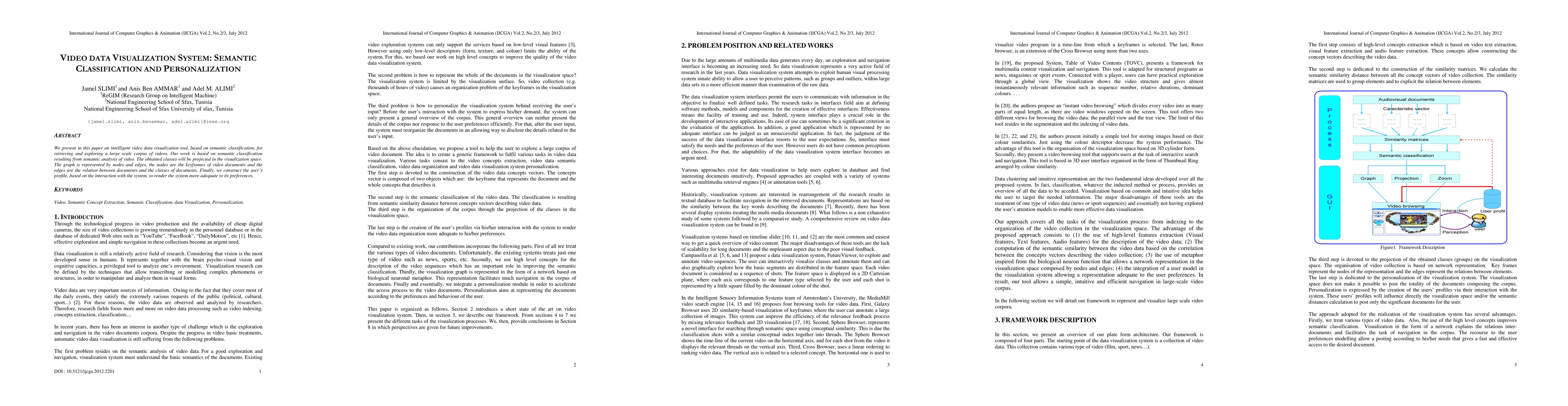 This paper introduces an intelligent video data visualization system that uses semantic classification for exploring large video corpora. The system visualizes keyframes and their relationships through nodes and edges, and personalizes the experience based on user interactions.
