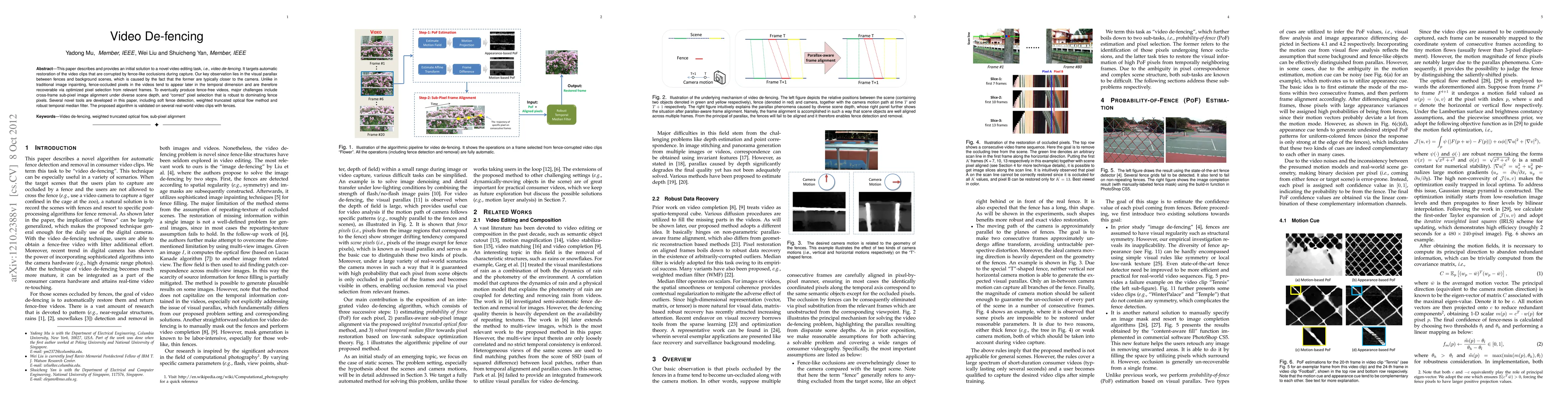 This paper describes and provides an initial solution to a novel video editing task, i.e., video de-fencing. It targets automatic restoration of the video clips that are corrupted by fence-like occlusions during capture. Our key observation lies in the visual parallax between fences and background scenes, which is caused by the fact that the former are typically closer to the camera. Unlike in traditional image inpainting, fence-occluded pixels in the videos tend to appear later in the temporal dimension and are therefore recoverable via optimized pixel selection from relevant frames. To eventually produce fence-free videos, major challenges include cross-frame sub-pixel image alignment under diverse scene depth, and "correct" pixel selection that is robust to dominating fence pixels. Several novel tools are developed in this paper, including soft fence detection, weighted truncated optical flow method and robust temporal median filter. The proposed algorithm is validated on several real-world video clips with fences.