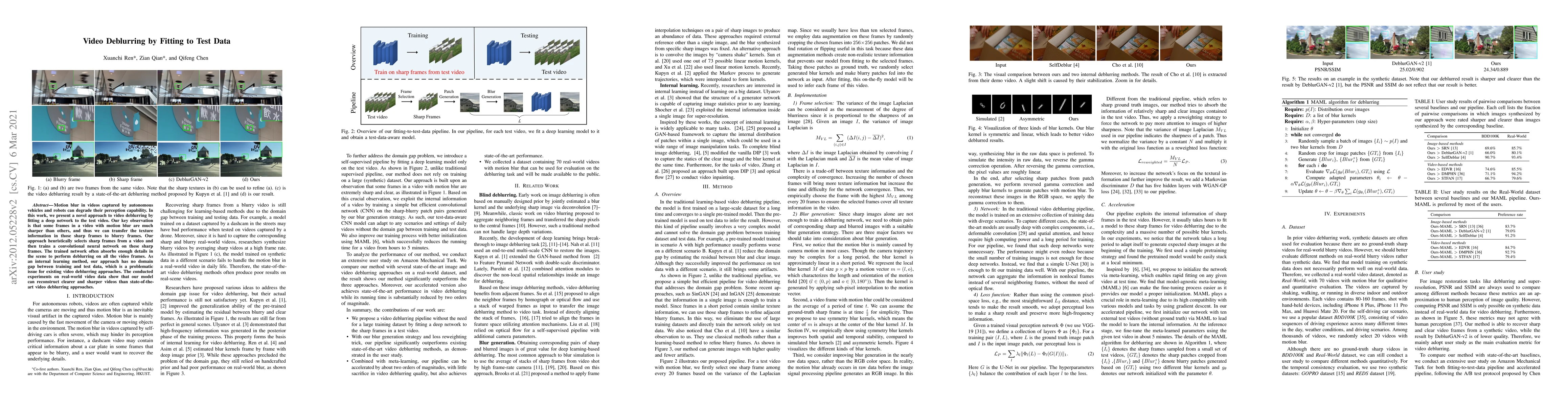 Motion blur in videos captured by autonomous vehicles and robots can degrade their perception capability. In this work, we present a novel approach to video deblurring by fitting a deep network to the test video. Our key observation is that some frames in a video with motion blur are much sharper than others, and thus we can transfer the texture information in those sharp frames to blurry frames. Our approach heuristically selects sharp frames from a video and then trains a convolutional neural network on these sharp frames. The trained network often absorbs enough details in the scene to perform deblurring on all the video frames. As an internal learning method, our approach has no domain gap between training and test data, which is a problematic issue for existing video deblurring approaches. The conducted experiments on real-world video data show that our model can reconstruct clearer and sharper videos than state-of-the-art video deblurring approaches. Code and data are available at https://github.com/xrenaa/Deblur-by-Fitting.