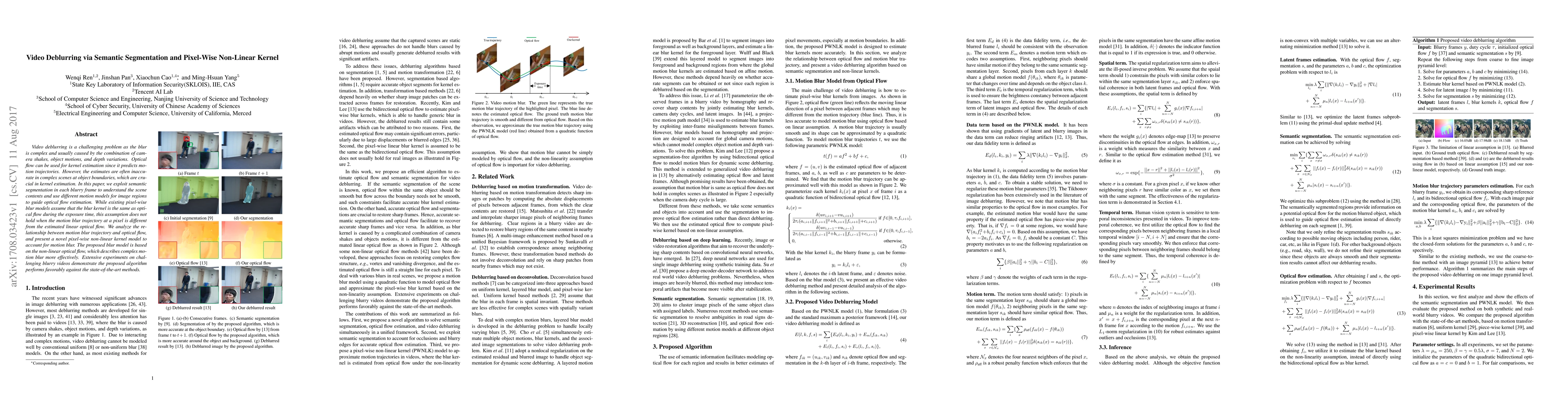 This paper proposes a video deblurring method that combines semantic segmentation and a pixel-wise non-linear kernel model to address complex blur caused by camera and object motion. It introduces a novel approach to better estimate blur kernels by considering non-linear optical flow, outperforming existing state-of-the-art techniques in experiments.