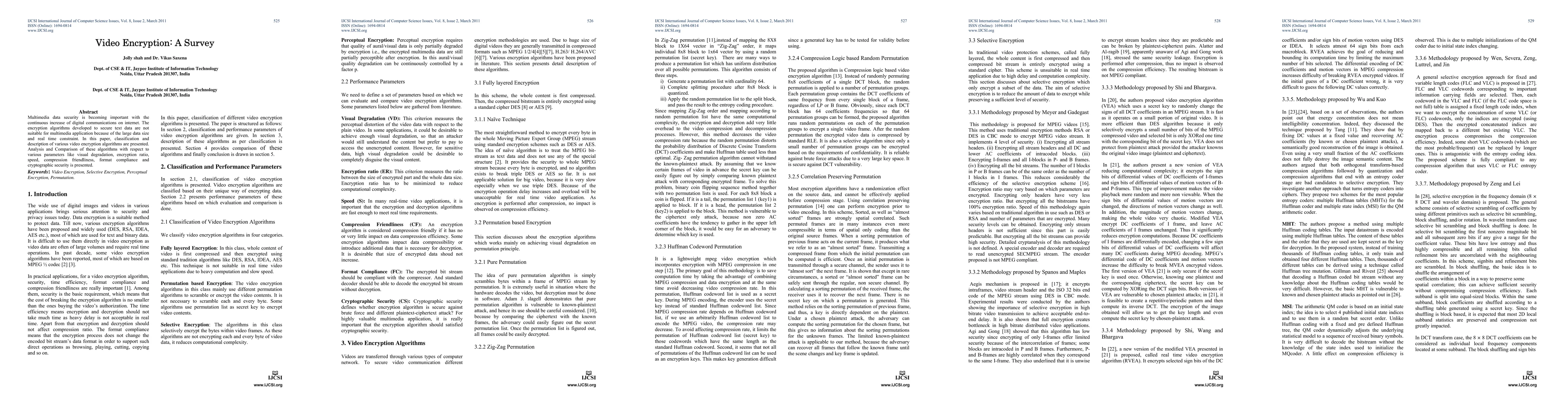 This paper surveys various video encryption algorithms, analyzing their performance on parameters like visual degradation, speed, compression friendliness, and cryptographic security.