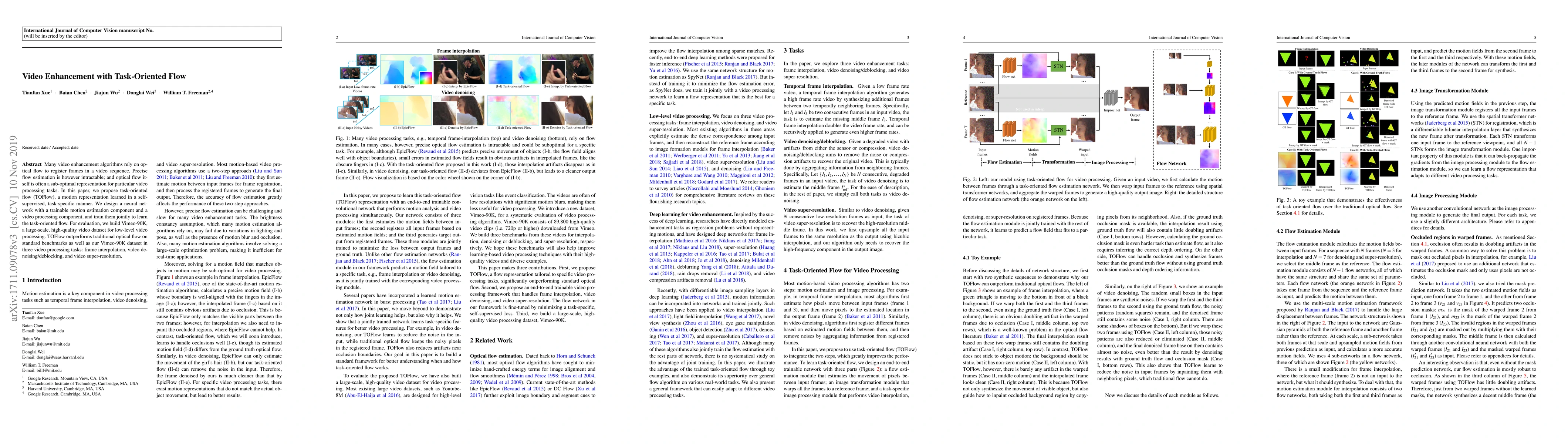 This paper introduces task-oriented flow (TOFlow), a self-supervised, task-specific motion representation, which outperforms traditional optical flow in frame interpolation, video denoising/deblocking, and super-resolution. The method is evaluated using a new dataset, Vimeo-90K, demonstrating its effectiveness across various video processing tasks.