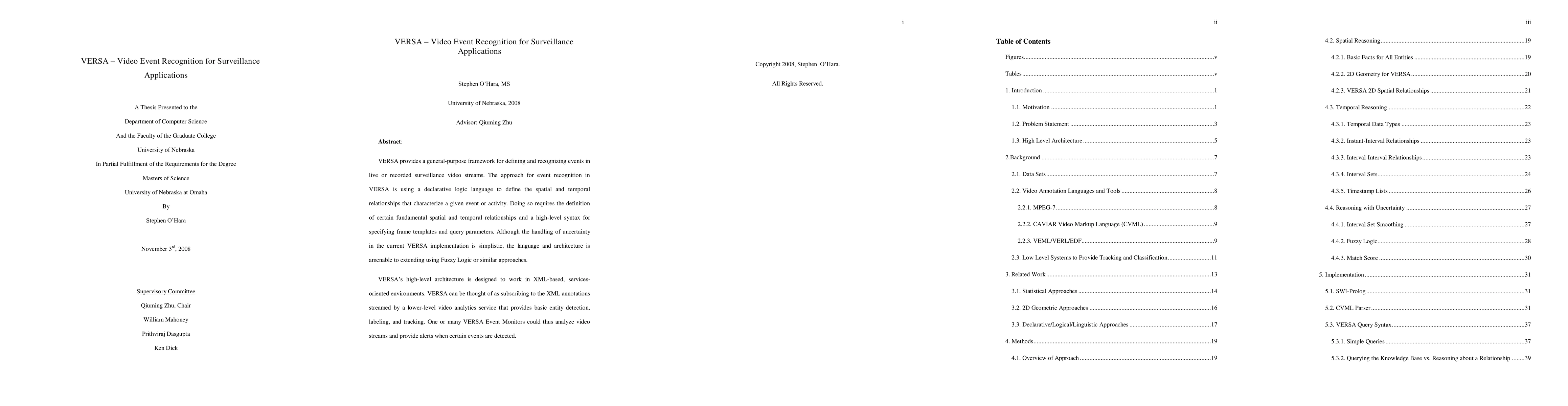 VERSA is a framework for recognizing events in surveillance videos using a declarative logic language to define spatial and temporal relationships. It is designed to work in XML-based, service-oriented environments and can be extended to handle uncertainty using advanced logic approaches.