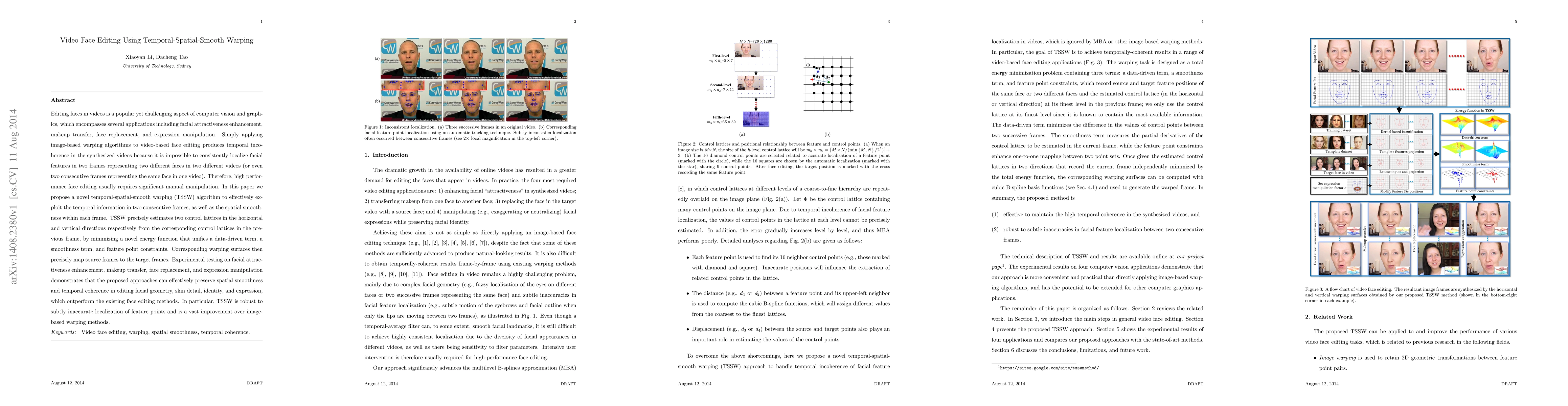 This paper introduces a novel temporal-spatial-smooth warping (TSSW) algorithm for face editing in videos that leverages temporal information and spatial smoothness to maintain coherence. The method outperforms existing image-based warping techniques by precisely mapping source frames to target frames, effectively preserving facial geometry, skin detail, identity, and expression.