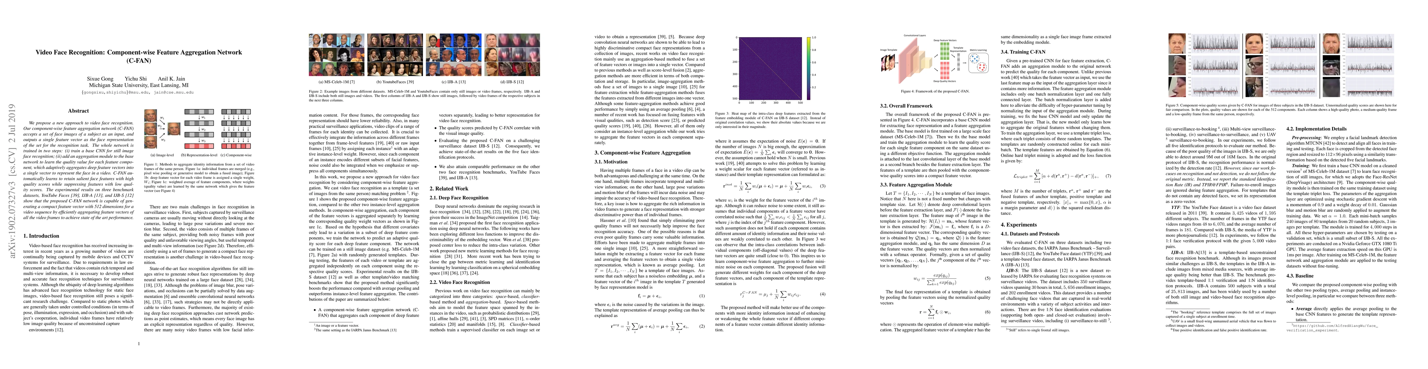 The paper proposes a Component-wise Feature Aggregation Network (C-FAN) for video face recognition, which aggregates deep feature vectors from video frames into a single, compact 512-dimensional feature vector, achieving state-of-the-art performance on benchmark datasets. The network trains in two steps: first a base CNN for still images, then an aggregation module for adaptive feature vector consolidation.