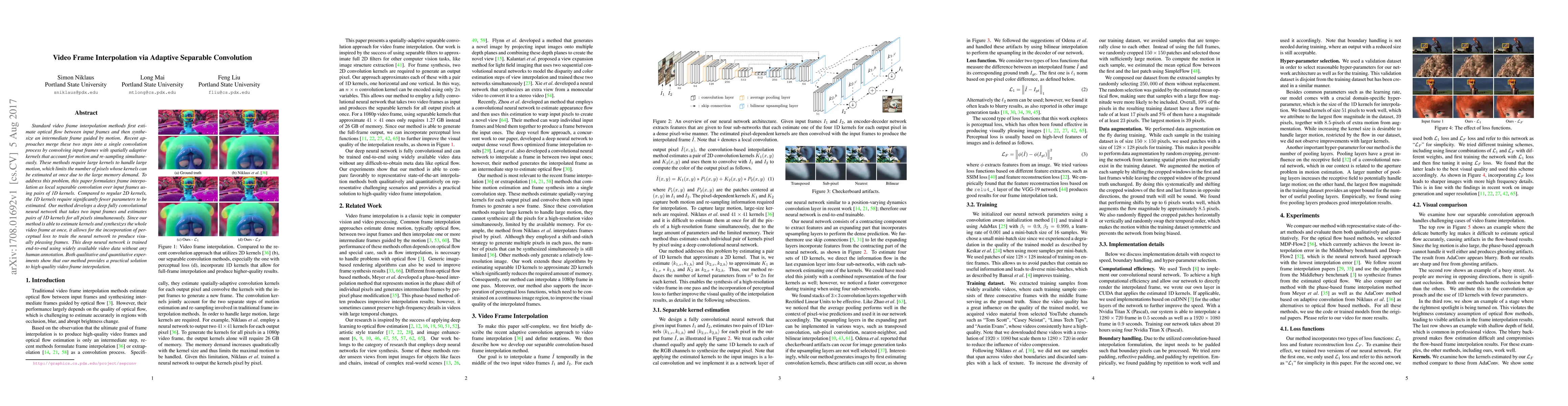 This paper proposes a method for video frame interpolation using adaptive separable convolution with 1D kernels, reducing memory demand and parameters compared to traditional 2D kernels. The approach trains a deep convolutional neural network to estimate 1D kernels and synthesize frames, incorporating perceptual loss for visually pleasing results, achieving high-quality interpolation without human annotations.