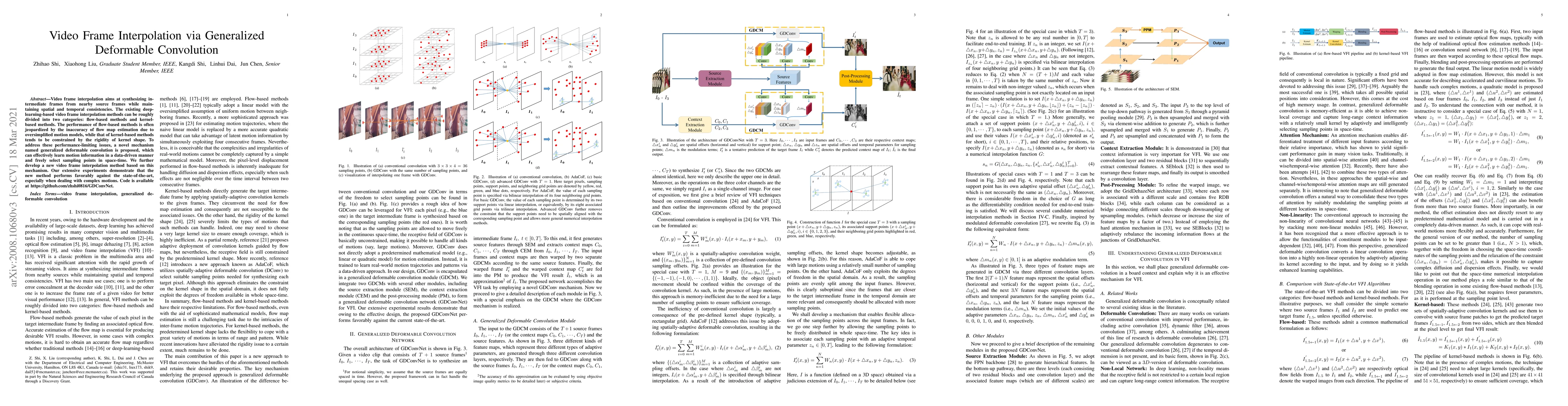 Summary: This paper introduces generalized deformable convolution to synthesize intermediate video frames, addressing the limitations of existing flow-based and kernel-based methods. Experiments show that the new method outperforms state-of-the-art techniques, particularly for complex motions.