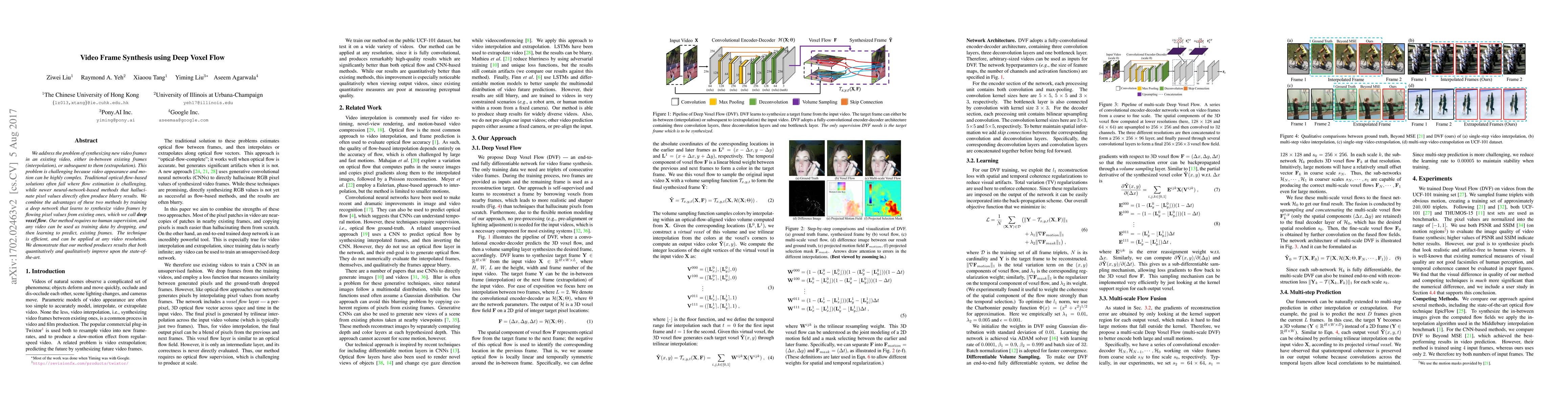 We address the problem of synthesizing new video frames in an existing video, either in-between existing frames (interpolation), or subsequent to them (extrapolation). This problem is challenging because video appearance and motion can be highly complex. Traditional optical-flow-based solutions often fail where flow estimation is challenging, while newer neural-network-based methods that hallucinate pixel values directly often produce blurry results. We combine the advantages of these two methods by training a deep network that learns to synthesize video frames by flowing pixel values from existing ones, which we call deep voxel flow. Our method requires no human supervision, and any video can be used as training data by dropping, and then learning to predict, existing frames. The technique is efficient, and can be applied at any video resolution. We demonstrate that our method produces results that both quantitatively and qualitatively improve upon the state-of-the-art.