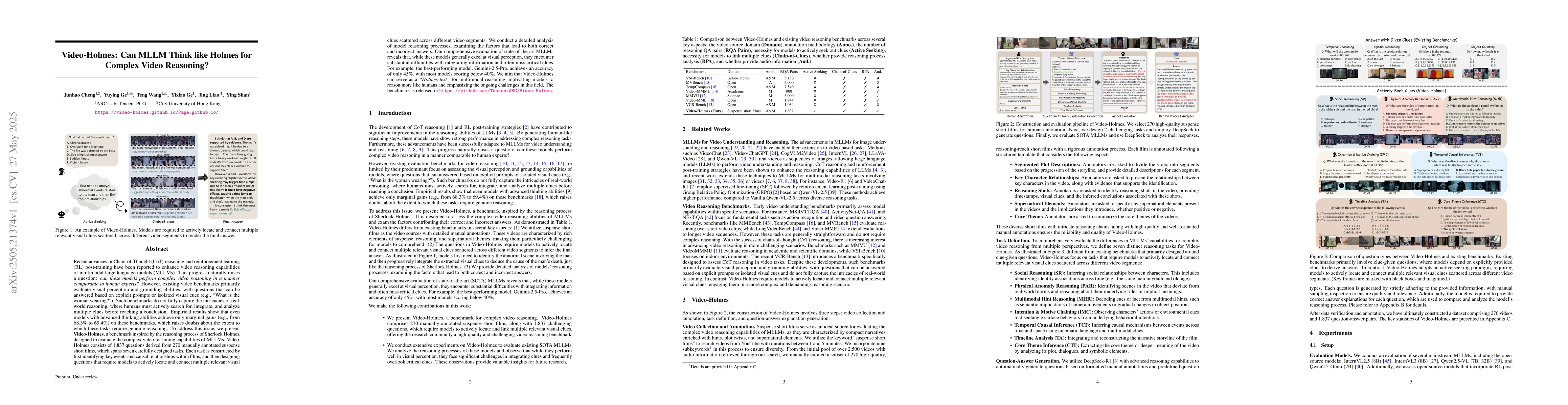 Video-Holmes, a novel benchmark for evaluating complex video reasoning in MLLMs, designed to assess models' ability to integrate and analyze multiple visual clues across video segments.