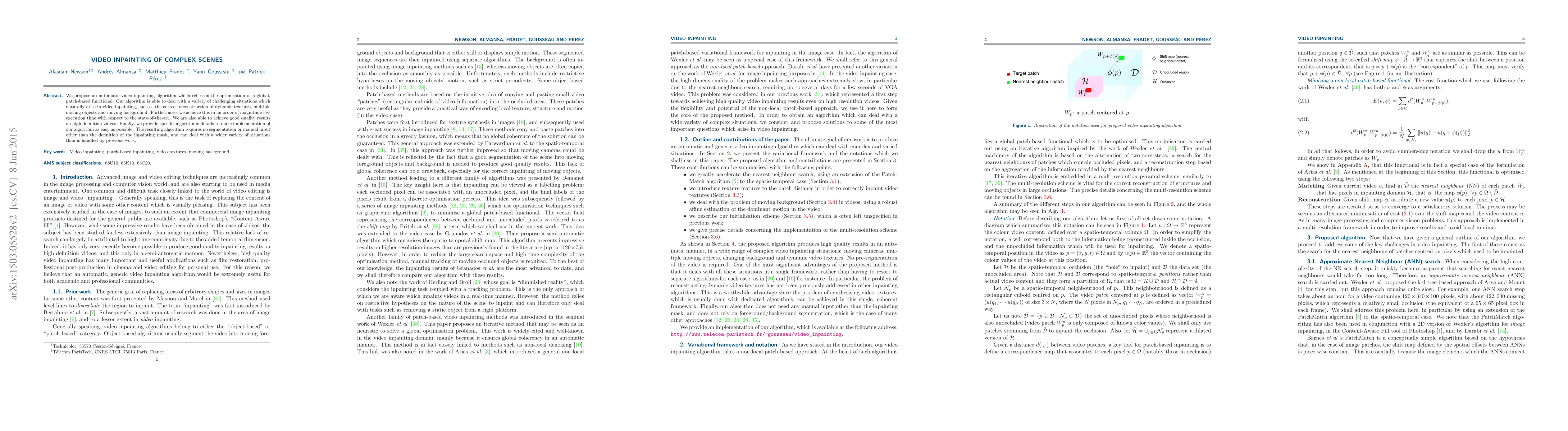 We propose an automatic video inpainting algorithm which relies on the optimisation of a global, patch-based functional. Our algorithm is able to deal with a variety of challenging situations which naturally arise in video inpainting, such as the correct reconstruction of dynamic textures, multiple moving objects and moving background. Furthermore, we achieve this in an order of magnitude less execution time with respect to the state-of-the-art. We are also able to achieve good quality results on high definition videos. Finally, we provide specific algorithmic details to make implementation of our algorithm as easy as possible. The resulting algorithm requires no segmentation or manual input other than the definition of the inpainting mask, and can deal with a wider variety of situations than is handled by previous work. 1. Introduction. Advanced image and video editing techniques are increasingly common in the image processing and computer vision world, and are also starting to be used in media entertainment. One common and difficult task closely linked to the world of video editing is image and video " inpainting ". Generally speaking, this is the task of replacing the content of an image or video with some other content which is visually pleasing. This subject has been extensively studied in the case of images, to such an extent that commercial image inpainting products destined for the general public are available, such as Photoshop's " Content Aware fill " [1]. However, while some impressive results have been obtained in the case of videos, the subject has been studied far less extensively than image inpainting. This relative lack of research can largely be attributed to high time complexity due to the added temporal dimension. Indeed, it has only very recently become possible to produce good quality inpainting results on high definition videos, and this only in a semi-automatic manner. Nevertheless, high-quality video inpainting has many important and useful applications such as film restoration, professional post-production in cinema and video editing for personal use. For this reason, we believe that an automatic, generic video inpainting algorithm would be extremely useful for both academic and professional communities.