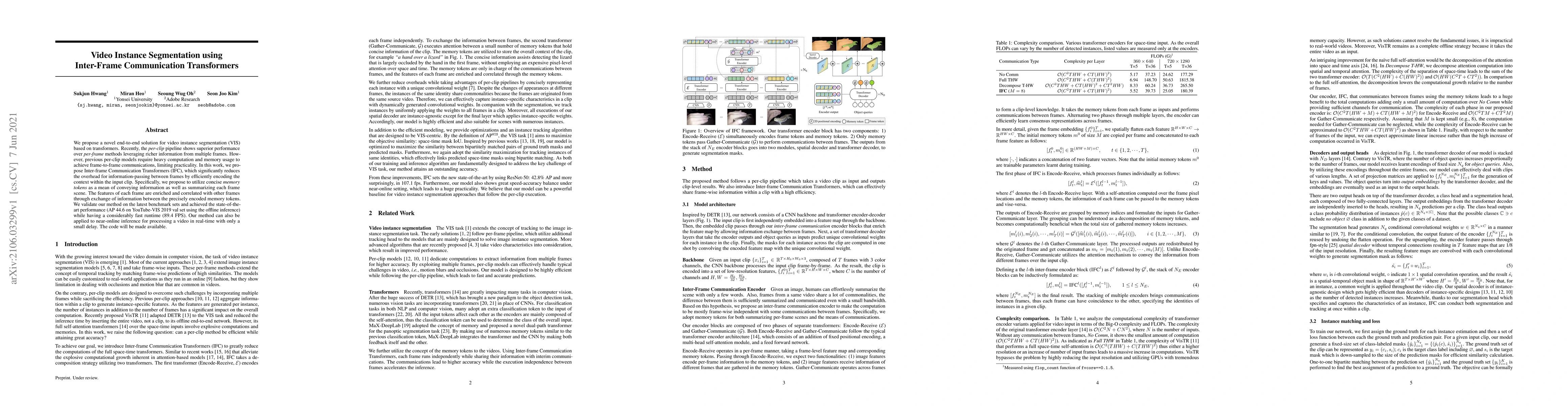 This paper proposes Inter-frame Communication Transformers (IFC) for video instance segmentation, achieving state-of-the-art performance with reduced computational overhead by using memory tokens to efficiently encode and pass context information between frames. The method achieves 44.6 AP on YouTube-VIS 2019 while maintaining a fast runtime of 89.4 FPS.