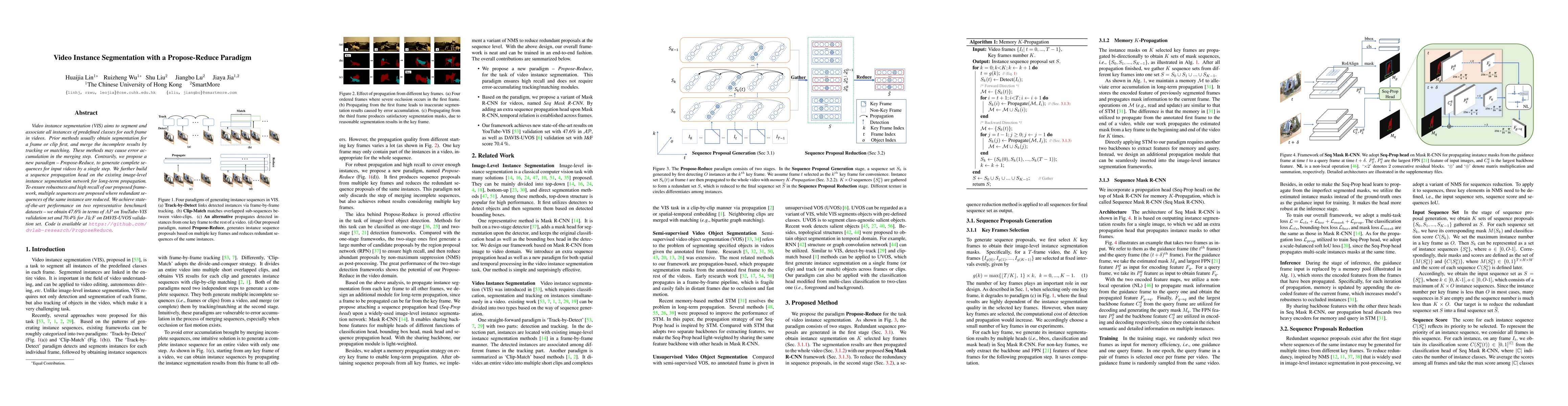 This paper proposes a new video instance segmentation paradigm called Propose-Reduce, which generates complete sequences for input videos with a single step. It achieves state-of-the-art performance on two benchmark datasets.