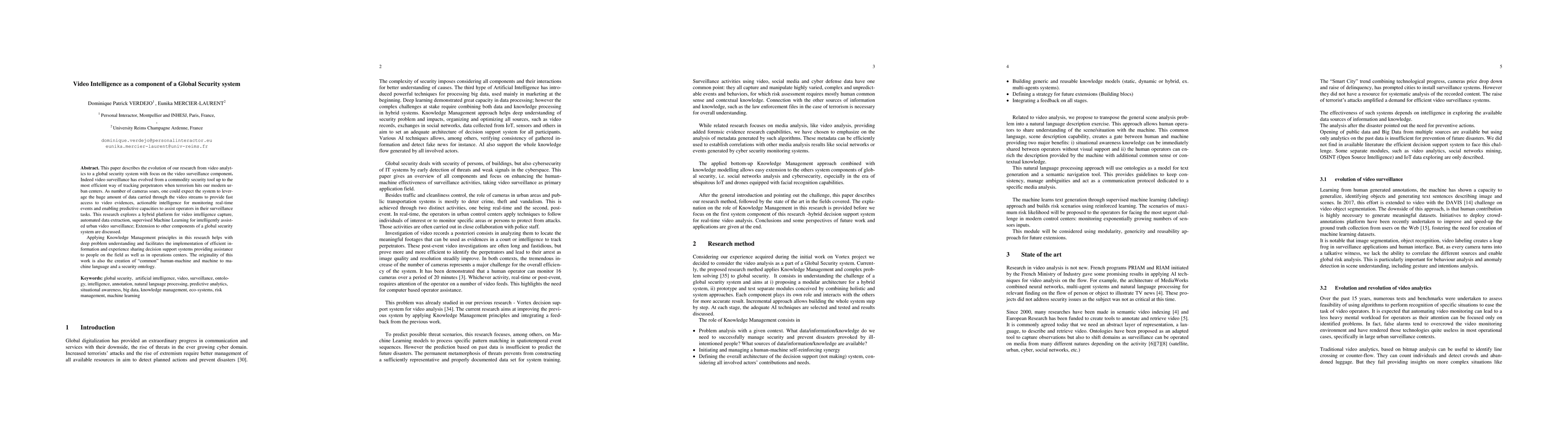 This paper describes the evolution of our research from video analytics to a global security system with focus on the video surveillance component. Indeed video surveillance has evolved from a commodity security tool up to the most efficient way of tracking perpetrators when terrorism hits our modern urban centers. As number of cameras soars, one could expect the system to leverage the huge amount of data carried through the video streams to provide fast access to video evidences, actionable intelligence for monitoring real-time events and enabling predictive capacities to assist operators in their surveillance tasks. This research explores a hybrid platform for video intelligence capture, automated data extraction, supervised Machine Learning for intelligently assisted urban video surveillance; Extension to other components of a global security system are discussed. Applying Knowledge Management principles in this research helps with deep problem understanding and facilitates the implementation of efficient information and experience sharing decision support systems providing assistance to people on the field as well as in operations centers. The originality of this work is also the creation of "common" human-machine and machine to machine language and a security ontology.