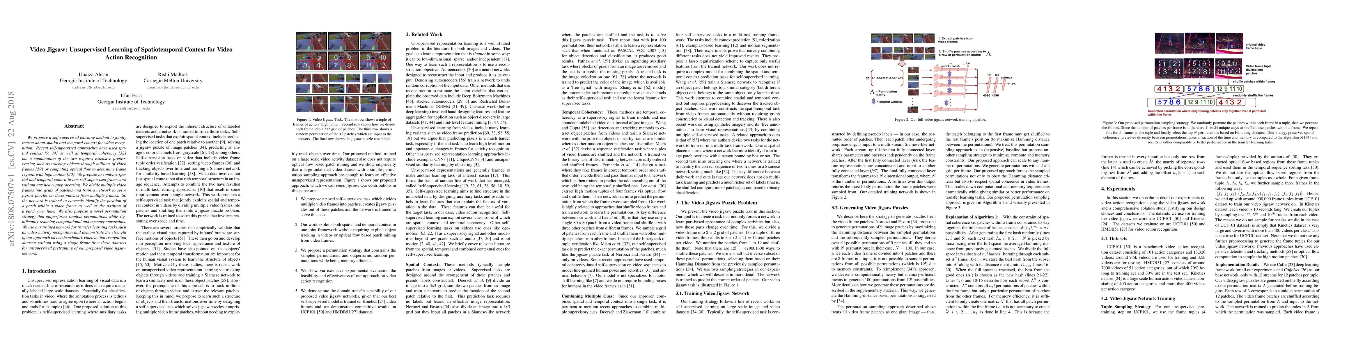 This paper proposes a self-supervised learning method called Video Jigsaw to learn spatiotemporal context for video action recognition without heavy preprocessing. The method trains a network by solving jigsaw puzzles of video patches, enabling it to reason about spatial and temporal context, and is demonstrated effectively on benchmark datasets.