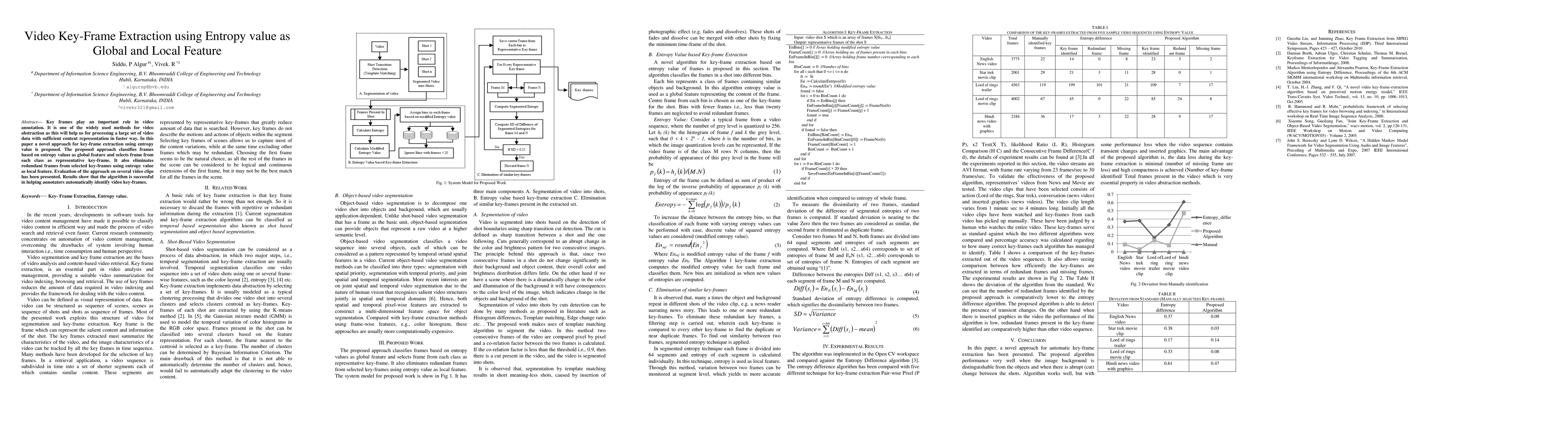 This paper proposes a novel method for key-frame extraction using entropy values as both global and local features. The approach classifies frames based on entropy for global representation and selects representative key-frames, while eliminating redundant frames using entropy as a local feature, demonstrating successful automatic identification of key-frames in video clips.