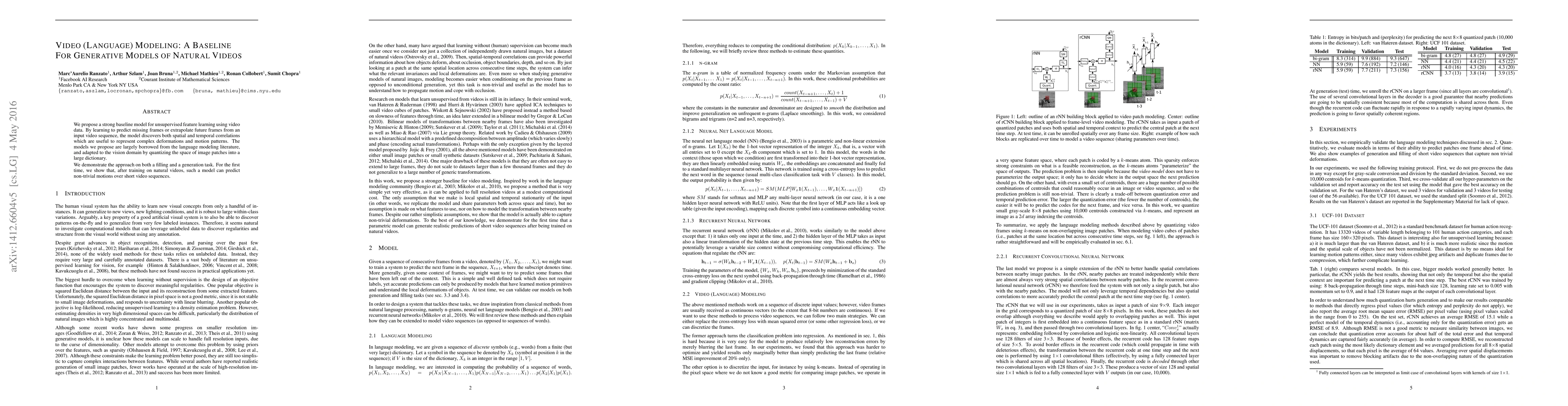 We propose a strong baseline model for unsupervised feature learning using video data. By learning to predict missing frames or extrapolate future frames from an input video sequence, the model discovers both spatial and temporal correlations which are useful to represent complex deformations and motion patterns. The models we propose are largely borrowed from the language modeling literature, and adapted to the vision domain by quantizing the space of image patches into a large dictionary. We demonstrate the approach on both a filling and a generation task. For the first time, we show that, after training on natural videos, such a model can predict non-trivial motions over short video sequences.