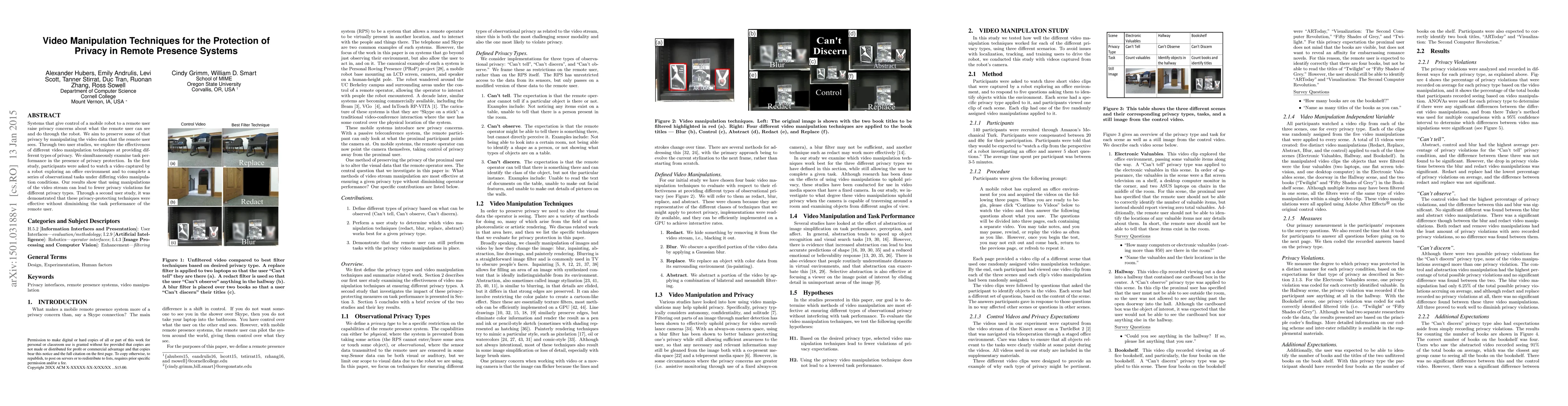 Research explores video manipulation techniques to protect privacy in remote presence systems, showing that these methods can reduce privacy violations without affecting task performance.