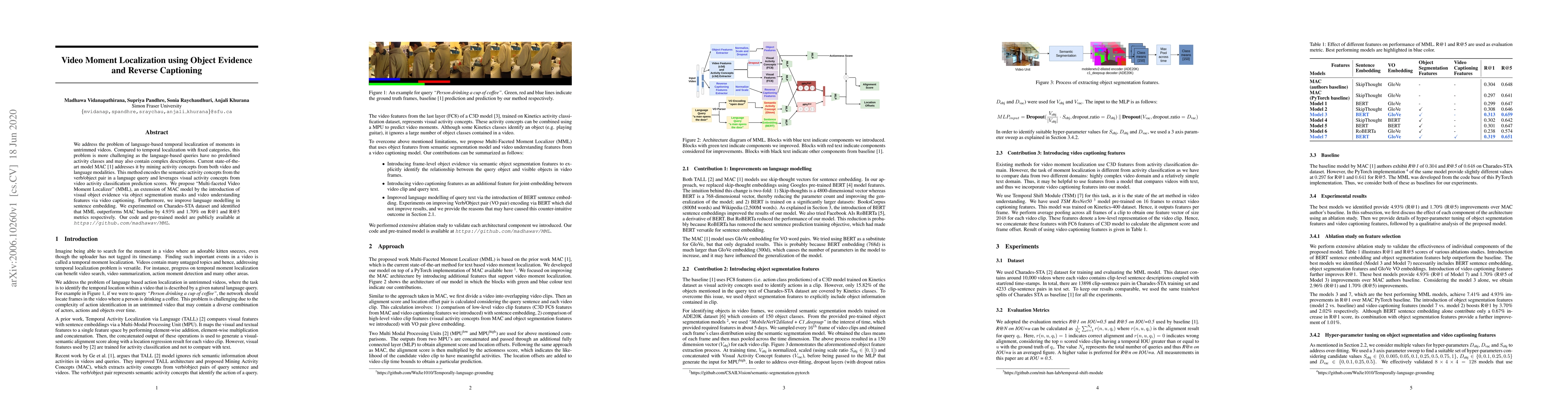 This paper proposes the "Multi-faceted VideoMoment Localizer" (MML) to enhance video moment localization using object evidence and reverse captioning. MML extends the MAC model by incorporating visual object segmentation and video captioning, achieving better performance on the Charades-STA dataset.