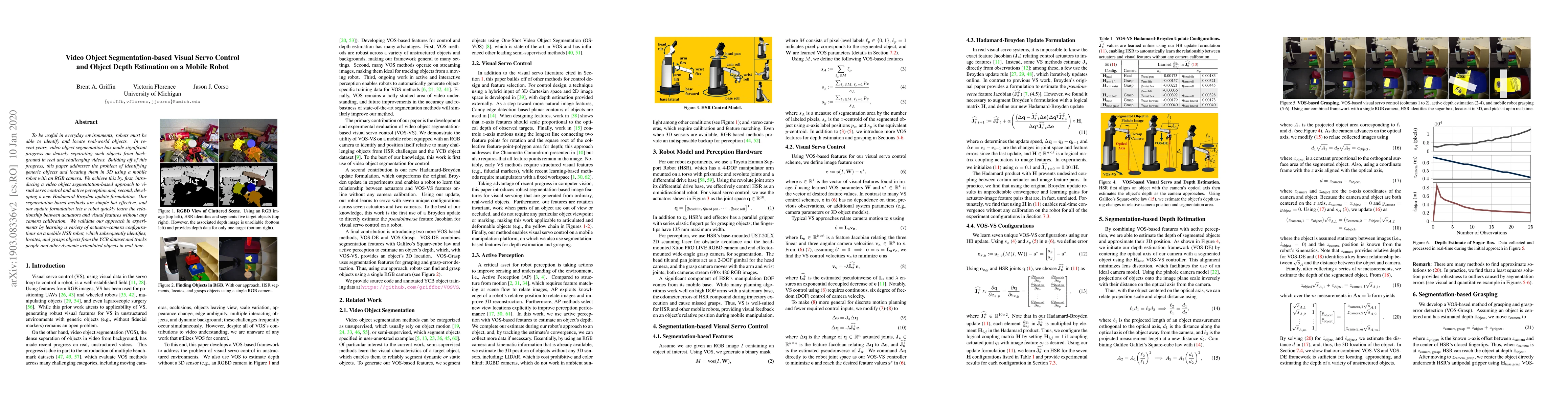 This paper presents a video object segmentation-based visual servo control method for a mobile robot to identify and locate objects in 3D using an RGB camera. It introduces a new Hadamard-Broyden update formulation to quickly learn actuator-visual feature relationships without camera calibration, validated through experiments on a mobile robot handling object identification and real-time tracking of dynamic objects.