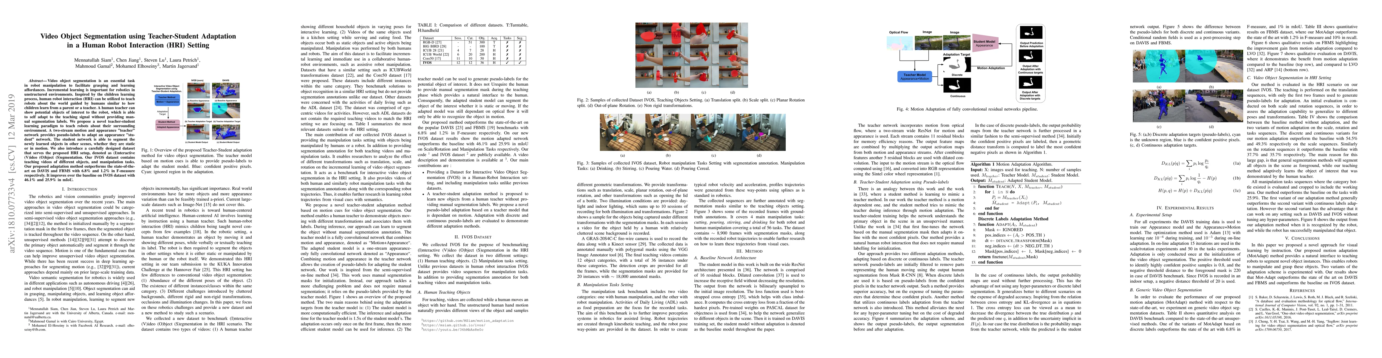 Video object segmentation is an essential task in robot manipulation to facilitate grasping and learning affordances. Incremental learning is important for robotics in unstructured environments, since the total number of objects and their variations can be intractable. Inspired by the children learning process, human robot interaction (HRI) can be utilized to teach robots about the world guided by humans similar to how children learn from a parent or a teacher. A human teacher can show potential objects of interest to the robot, which is able to self adapt to the teaching signal without providing manual segmentation labels. We propose a novel teacher-student learning paradigm to teach robots about their surrounding environment. A two-stream motion and appearance "teacher" network provides pseudo-labels to adapt an appearance "student" network. The student network is able to segment the newly learned objects in other scenes, whether they are static or in motion. We also introduce a carefully designed dataset that serves the proposed HRI setup, denoted as (I)nteractive (V)ideo (O)bject (S)egmentation. Our IVOS dataset contains teaching videos of different objects, and manipulation tasks. Unlike previous datasets, IVOS provides manipulation tasks sequences with segmentation annotation along with the waypoints for the robot trajectories. It also provides segmentation annotation for the different transformations such as translation, scale, planar rotation, and out-of-plane rotation. Our proposed adaptation method outperforms the state-of-the-art on DAVIS and FBMS with 6.8% and 1.2% in F-measure respectively. It improves over the baseline on IVOS dataset with 46.1% and 25.9% in mIoU.