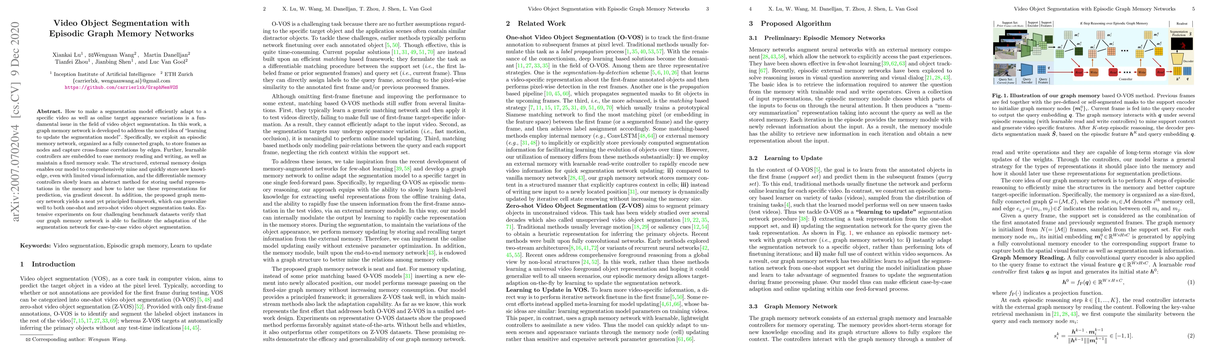 This paper proposes a graph memory network to efficiently adapt video object segmentation models to specific videos and online target appearance variations. The model uses an episodic memory network to store frames as nodes and learnable controllers to manage memory, enabling it to quickly adapt to new knowledge and generalize to one-shot and zero-shot segmentation tasks.