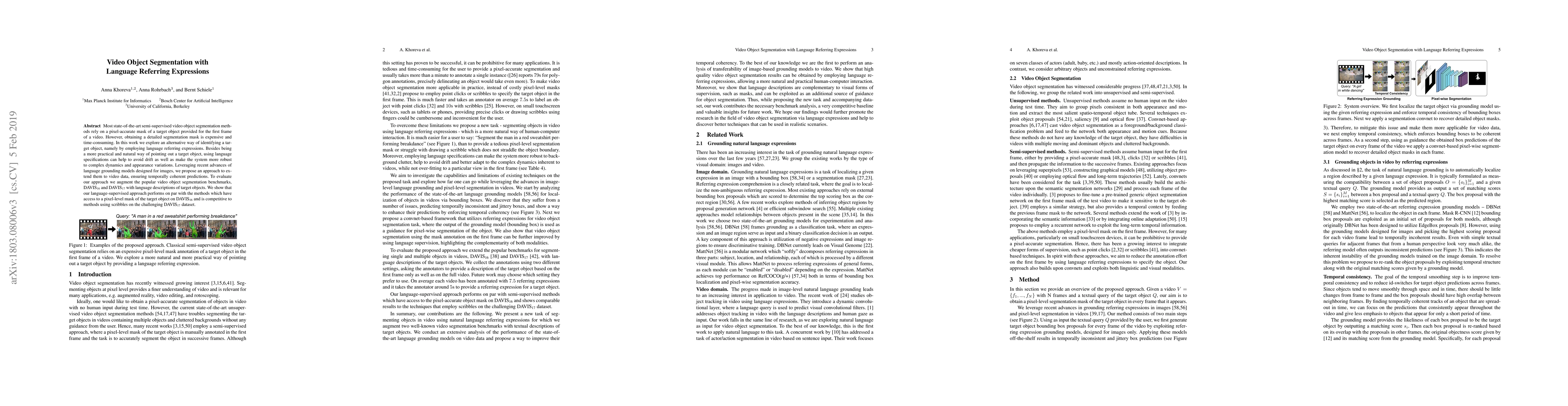 This paper explores using language referring expressions to identify target objects in video object segmentation, offering a more practical and robust alternative to traditional pixel-accurate masks. The proposed method leverages language grounding models to achieve temporally coherent predictions, demonstrating competitive performance on DAVIS benchmarks.