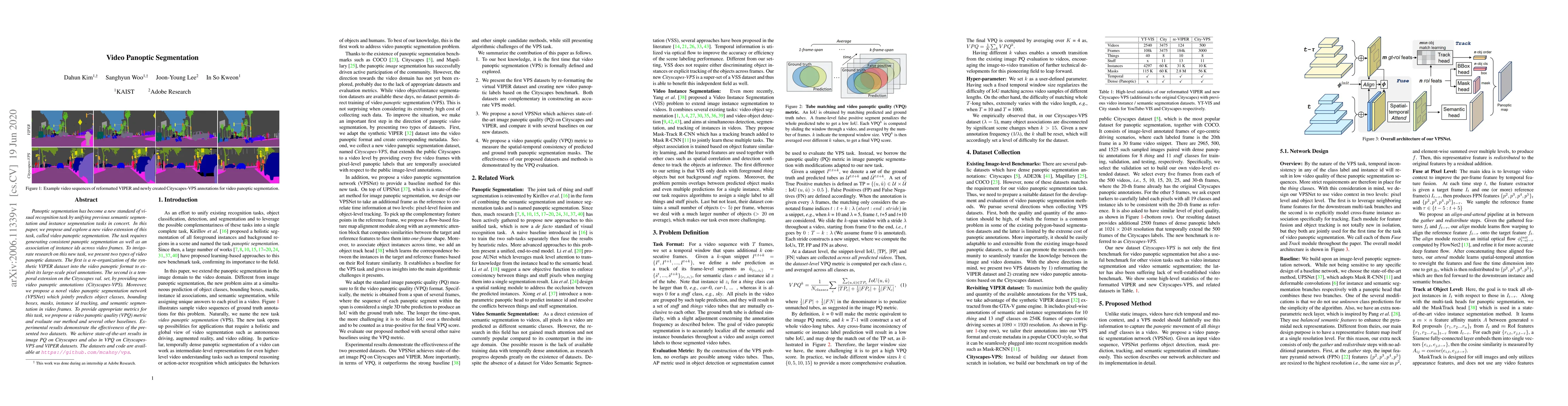 This paper introduces video panoptic segmentation, extending the panoptic segmentation concept to video, and presents two new datasets: a synthetic dataset reorganized into video panoptic format and a temporal extension of Cityscapes. It also proposes a novel VPSNet network and a video panoptic quality metric, achieving state-of-the-art results on the introduced datasets.