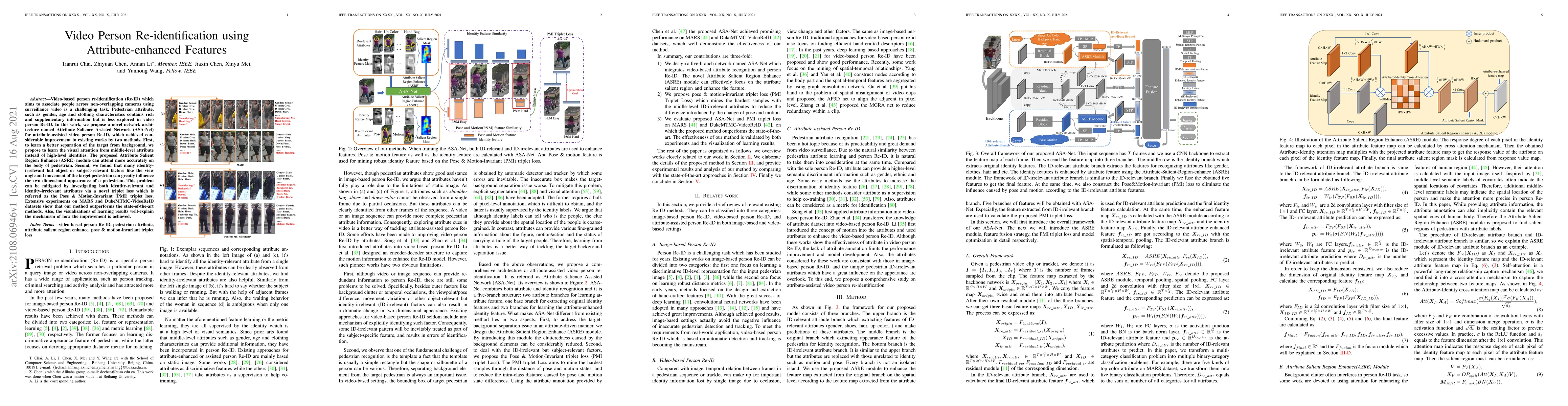 This paper proposes an Attribute Salience Assisted Network (ASA-Net) for video-based person re-identification, utilizing pedestrian attributes to enhance feature learning. The Attribute Salient Region Enhance (ASRE) module improves focus on the pedestrian's body, while the Pose & Motion-Invariant (PMI) triplet loss addresses view angle and movement variations, achieving better separation and identification across non-overlapping cameras.