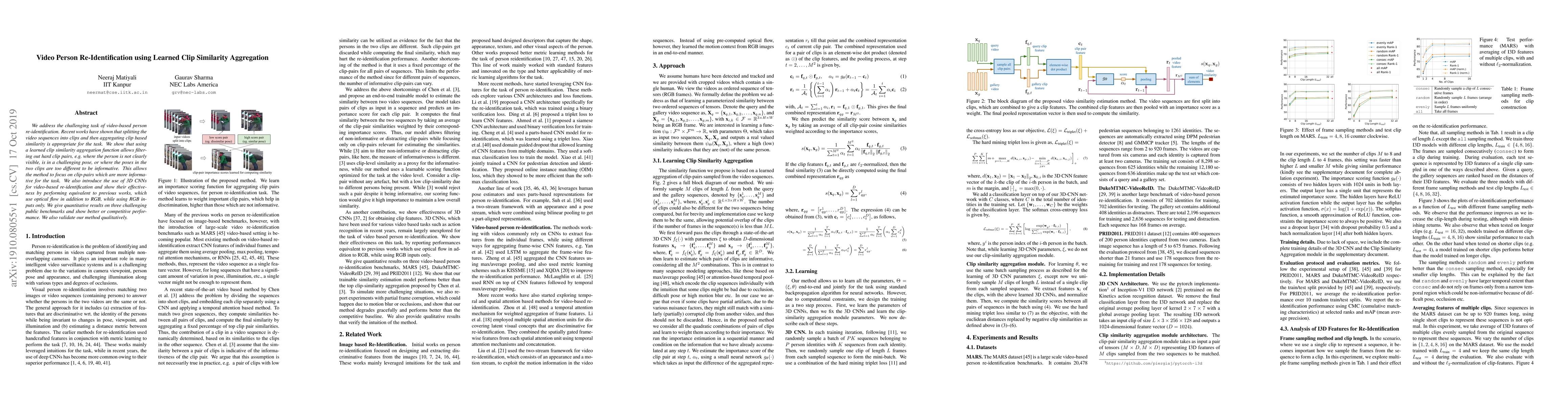This paper proposes a method for video-based person re-identification using learned clip similarity aggregation, which filters out non-informative clip pairs to focus on more relevant ones. It employs 3D CNNs for effective re-identification using only RGB inputs, achieving competitive performance on public benchmarks.