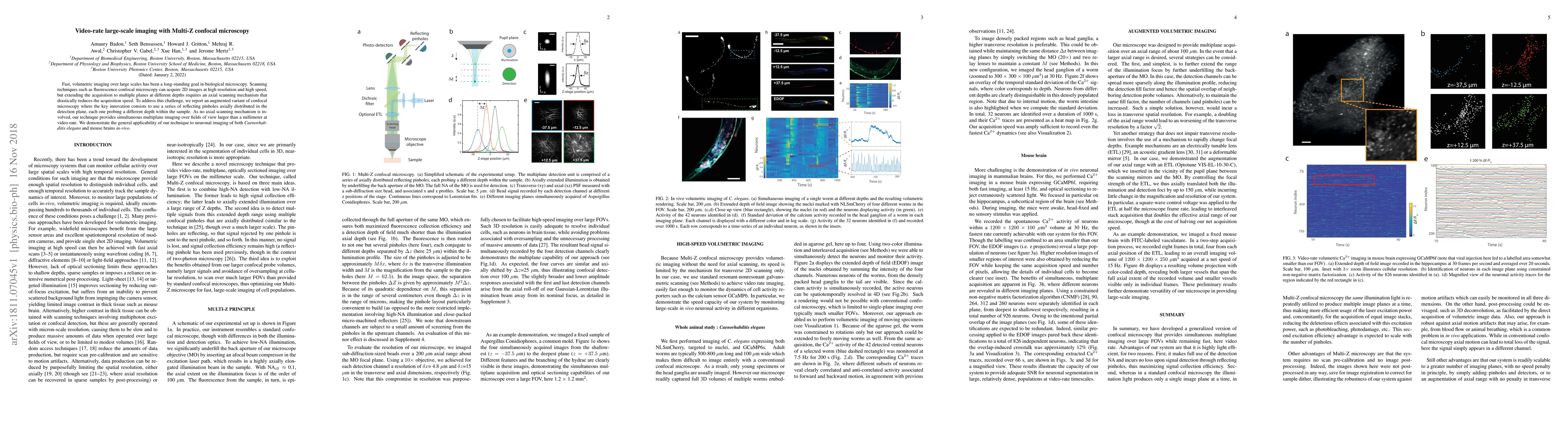 Fast, volumetric imaging over large scales has been a long-standing goal in biological microscopy. Scanning techniques such as fluorescence confocal microscopy can acquire 2D images at high resolution and high speed, but extending the acquisition to multiple planes at different depths requires an axial scanning mechanism that drastically reduces the acquisition speed. To address this challenge, we report an augmented variant of confocal microscopy where the key innovation consists to use a series of reflecting pinholes axially distributed in the detection plane, each one probing a different depth within the sample. As no axial scanning mechanism is involved, our technique provides simultaneous multiplane imaging over fields of view larger than a millimeter at video-rate. We demonstrate the general applicability of our technique to neuronal imaging of both Caenorhabditis elegans and mouse brains in-vivo.